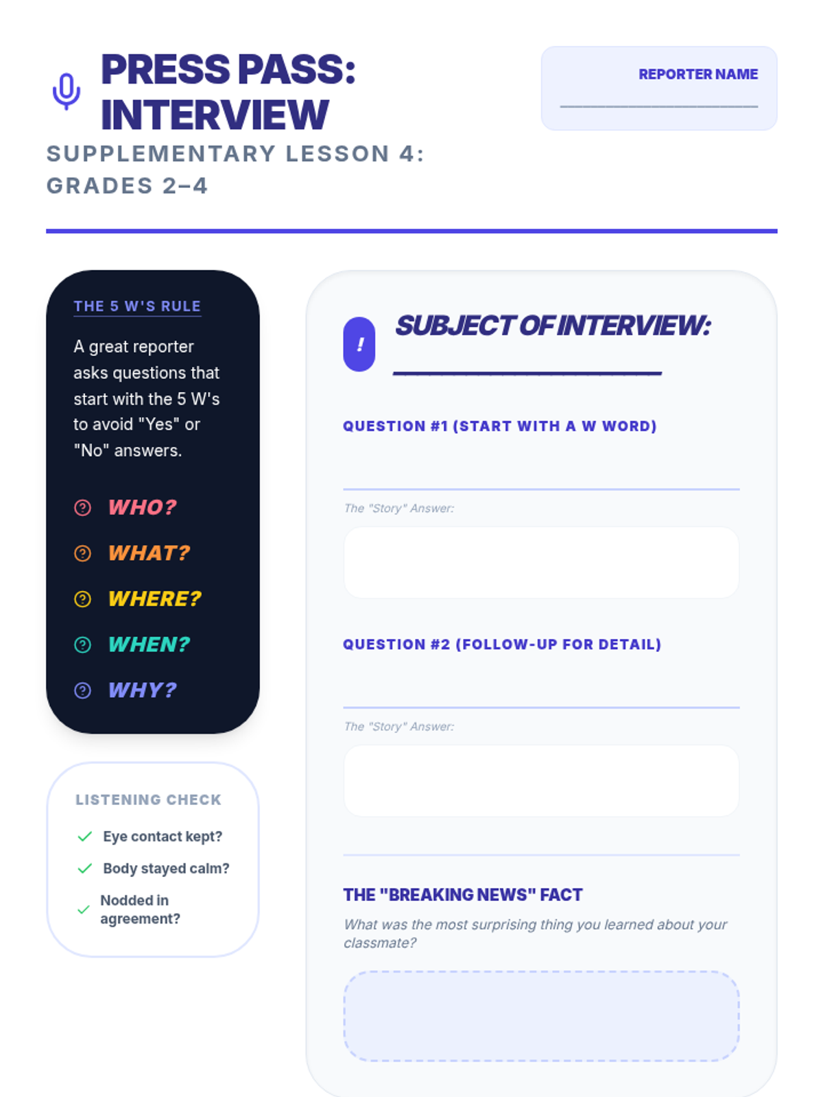 A professional 'Junior Reporter' interview guide for grades 2-4, teaching students to use open-ended questions (The 5 W's) and take structured notes while practicing active listening.