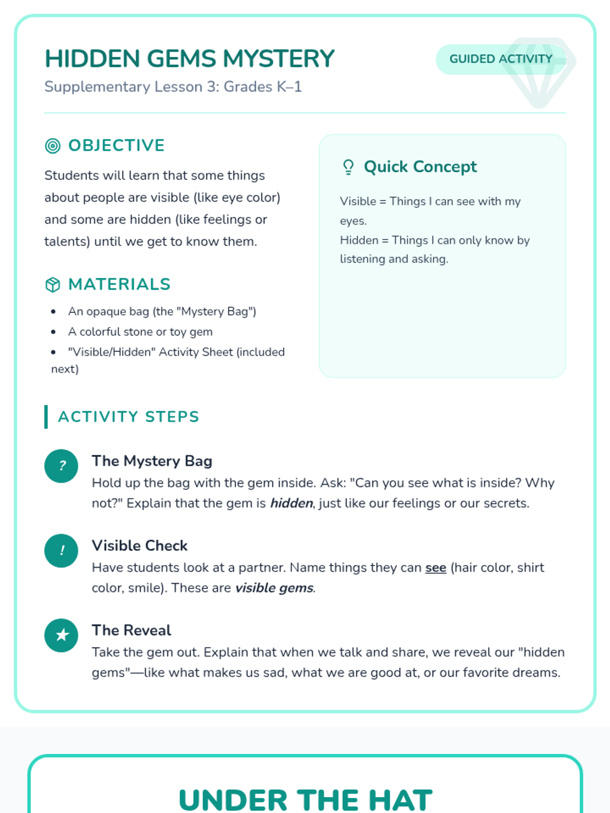 An activity and worksheet for K-1 students to differentiate between visible physical traits and hidden internal qualities like feelings and talents.