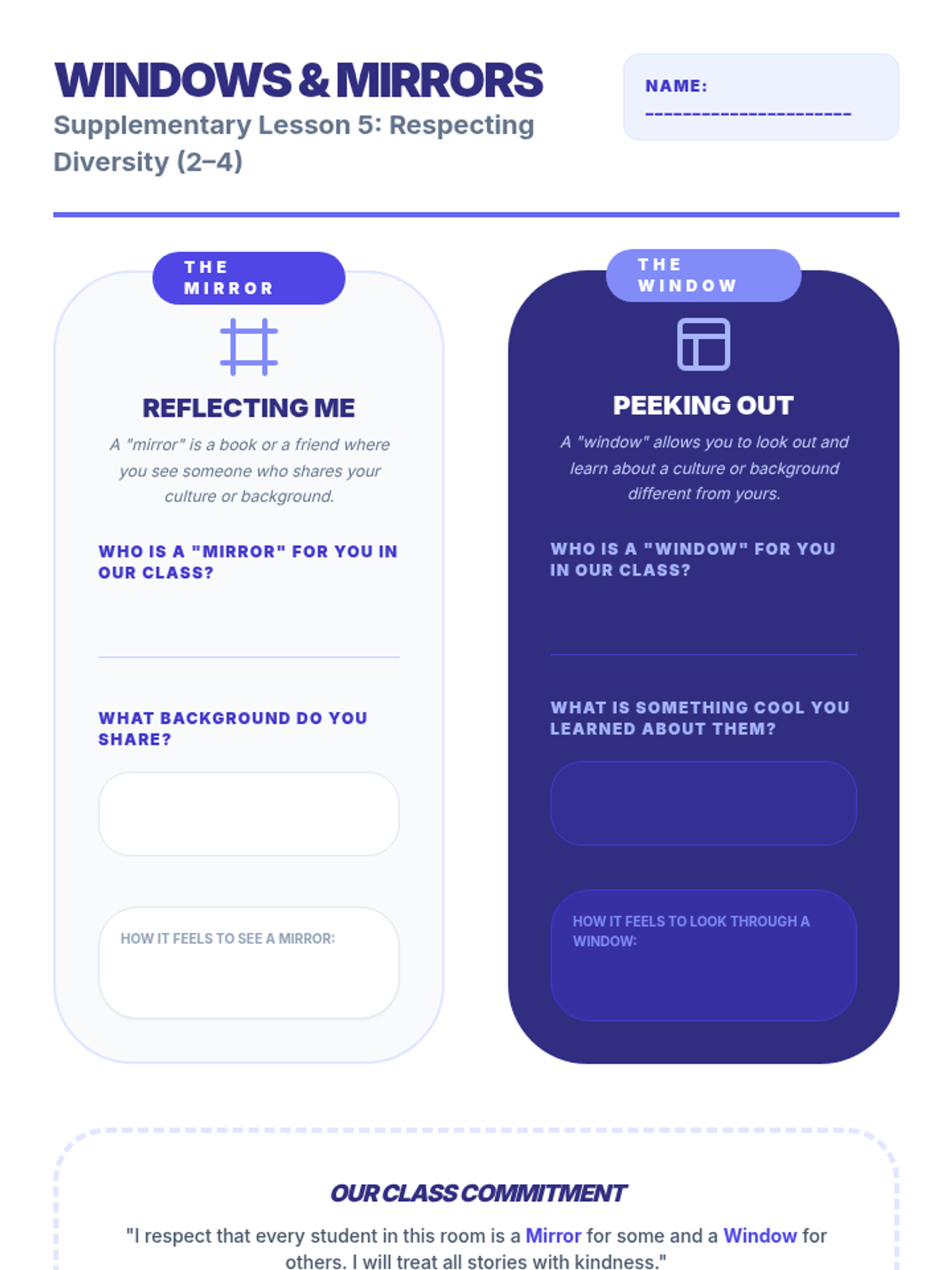 A reflective worksheet for grades 2-4 using the 'Windows and Mirrors' framework to help students appreciate both their own identities and the diverse backgrounds of their peers.
