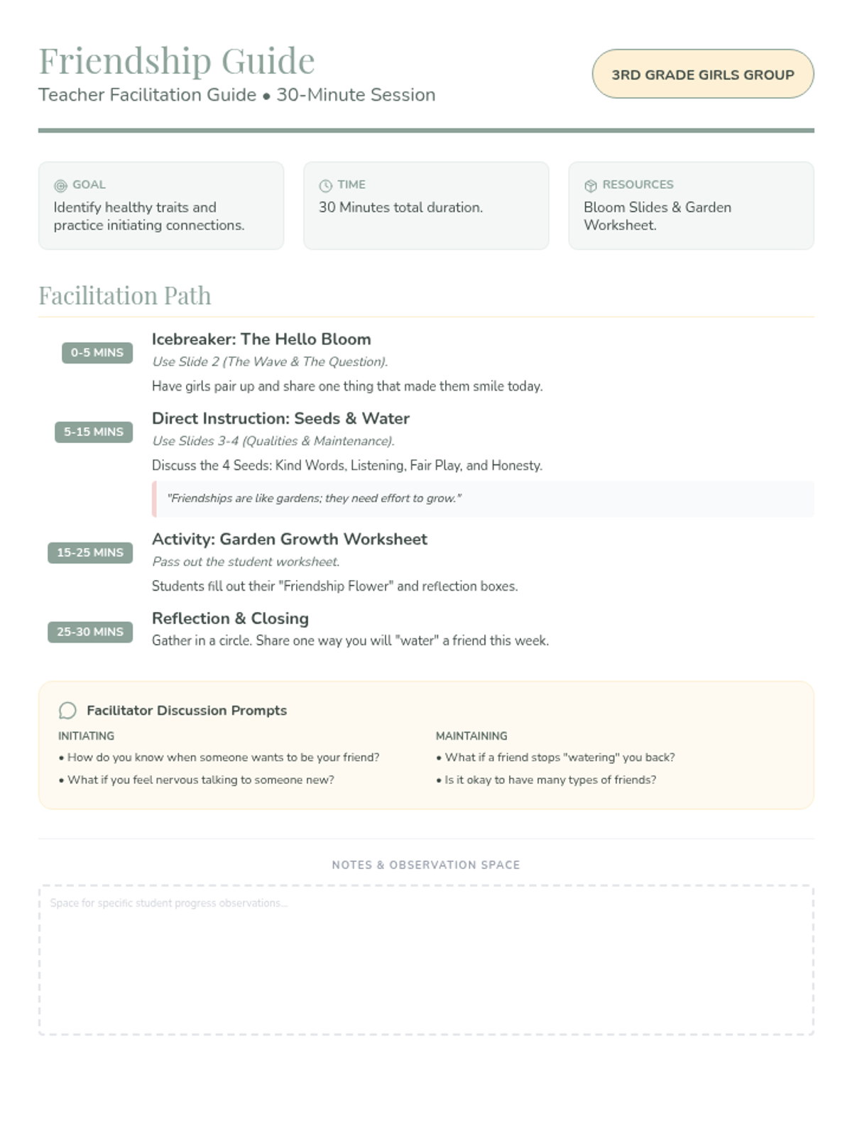 A comprehensive teacher's guide for a 30-minute friendship group session, including a step-by-step pacing guide, discussion prompts, and facilitation tips for 3rd-grade girls.
