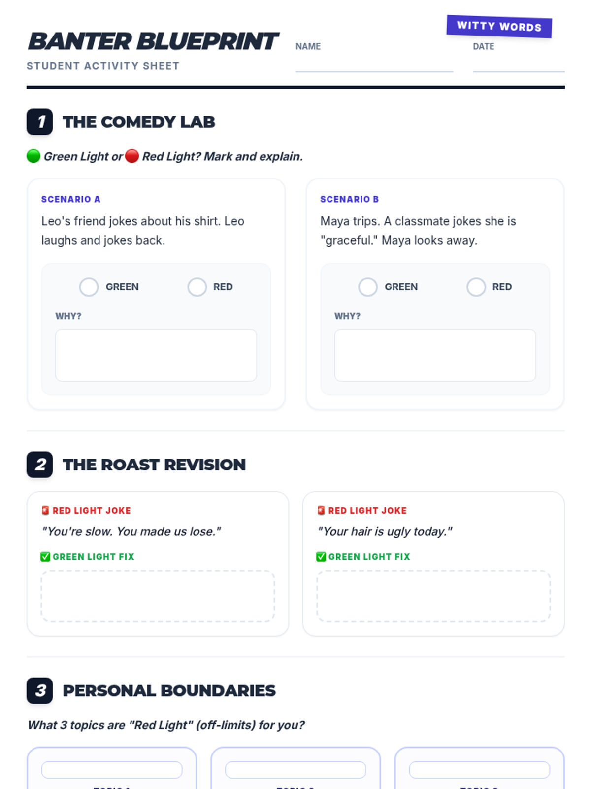 A student-facing activity sheet that uses scenario analysis and 'Roast Revision' exercises to help 4th and 5th graders understand the difference between playful humor and bullying, while identifying their own personal boundaries.