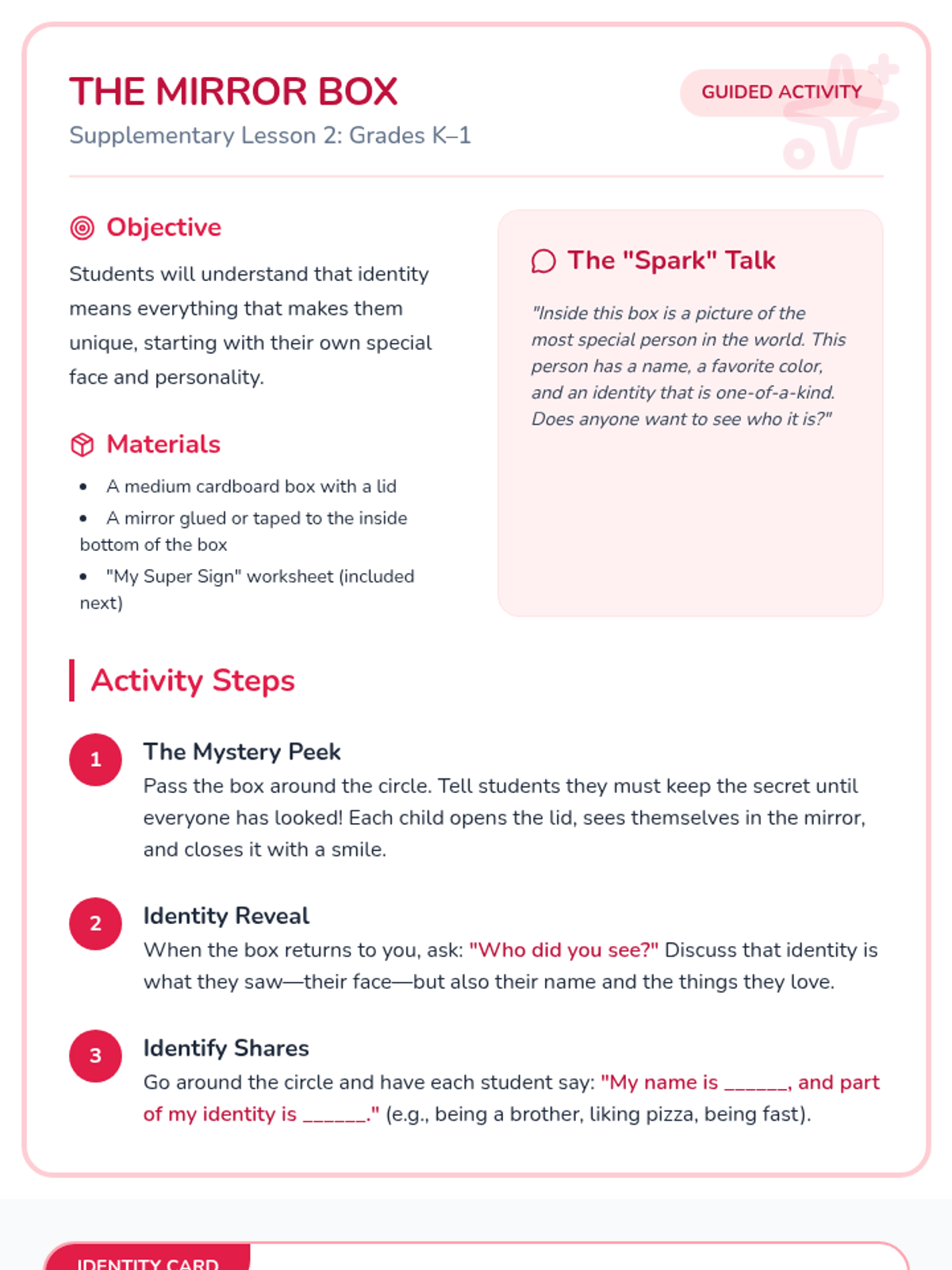 A guided activity called 'The Mirror Box' and a creative drawing worksheet for grades K-1 to help students explore and celebrate their personal identity.