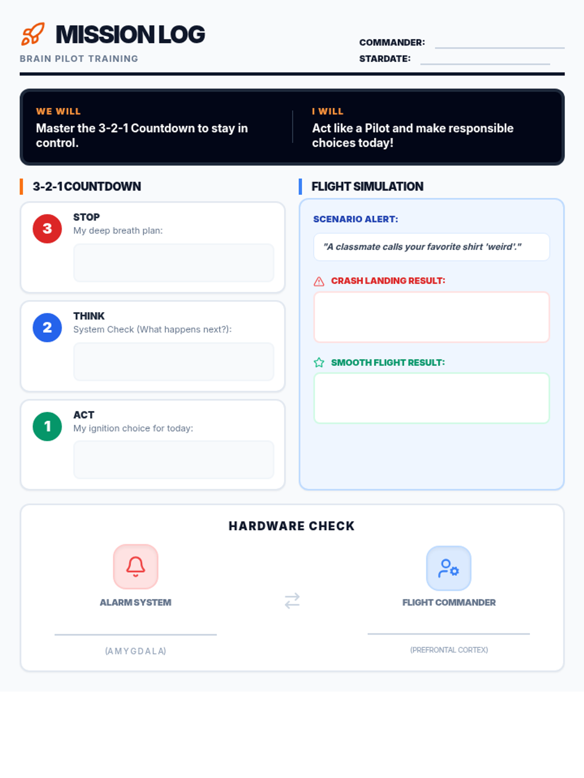 An updated space-themed worksheet for 3rd graders. Now includes a 'Flight Simulation' section where students predict 'Crash Landing' vs 'Smooth Flight' results for a realistic social scenario, alongside the original hardware check and countdown steps. Revised for single-page fit.