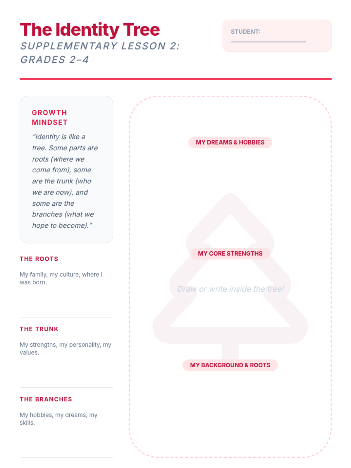 A symbolic identity mapping worksheet for grades 2-4 using a tree metaphor to explore roots, core strengths, and future dreams.