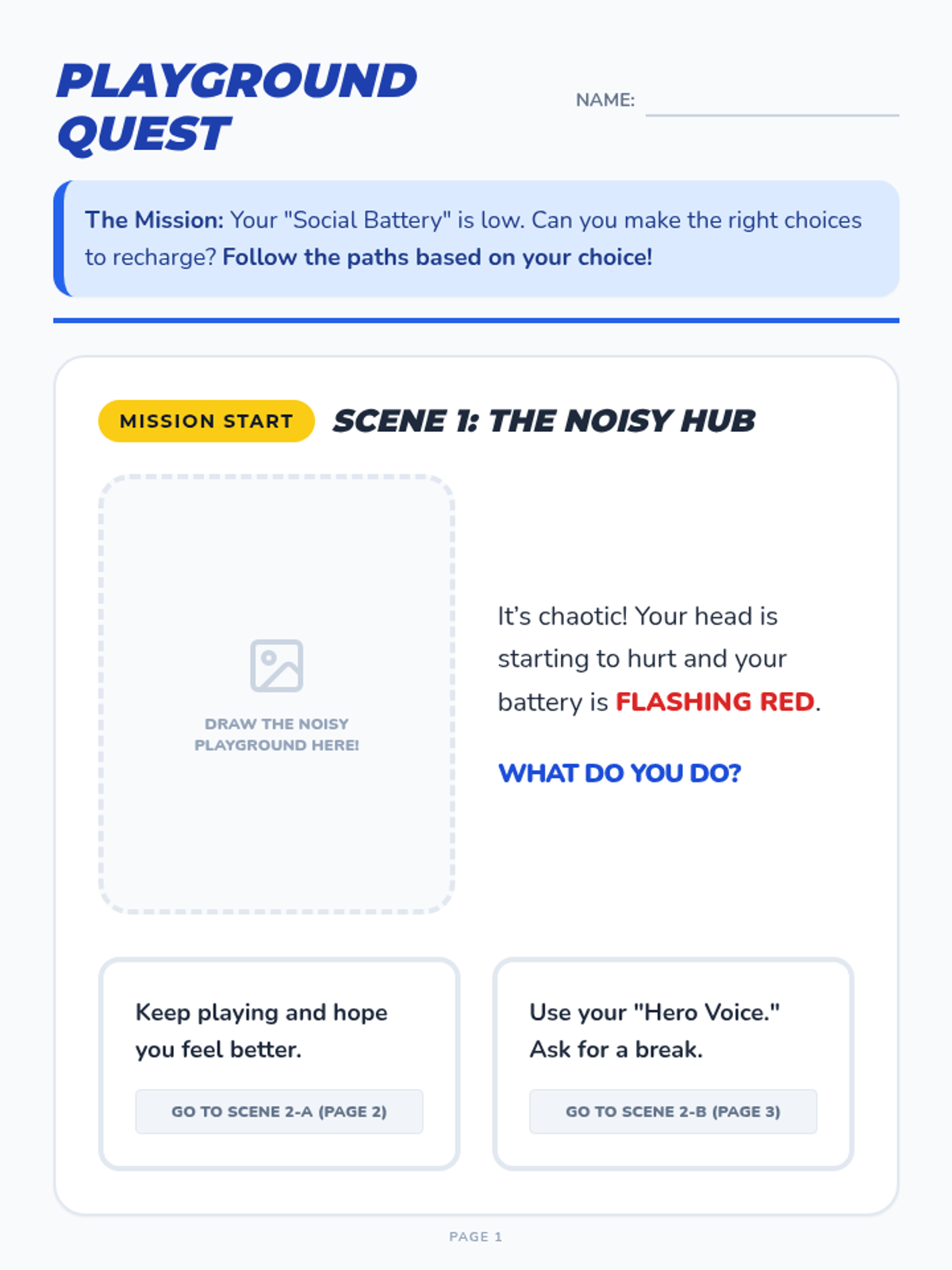 An interactive, choice-based storyboard worksheet for 3rd-grade students. Features 4 distinct pages for branching paths and a final mission (Tag vs Soccer), ensuring a clean print layout with dedicated student work areas.