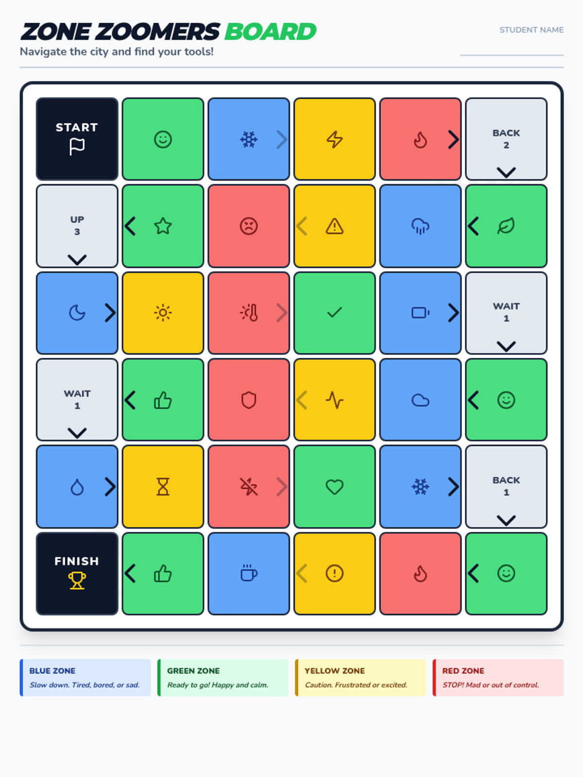 A visually engaging printable board game themed around a city race track. Students move through spaces representing the four zones of regulation, designed for use with prompt cards. fixed for one-page printing with a continuous path.