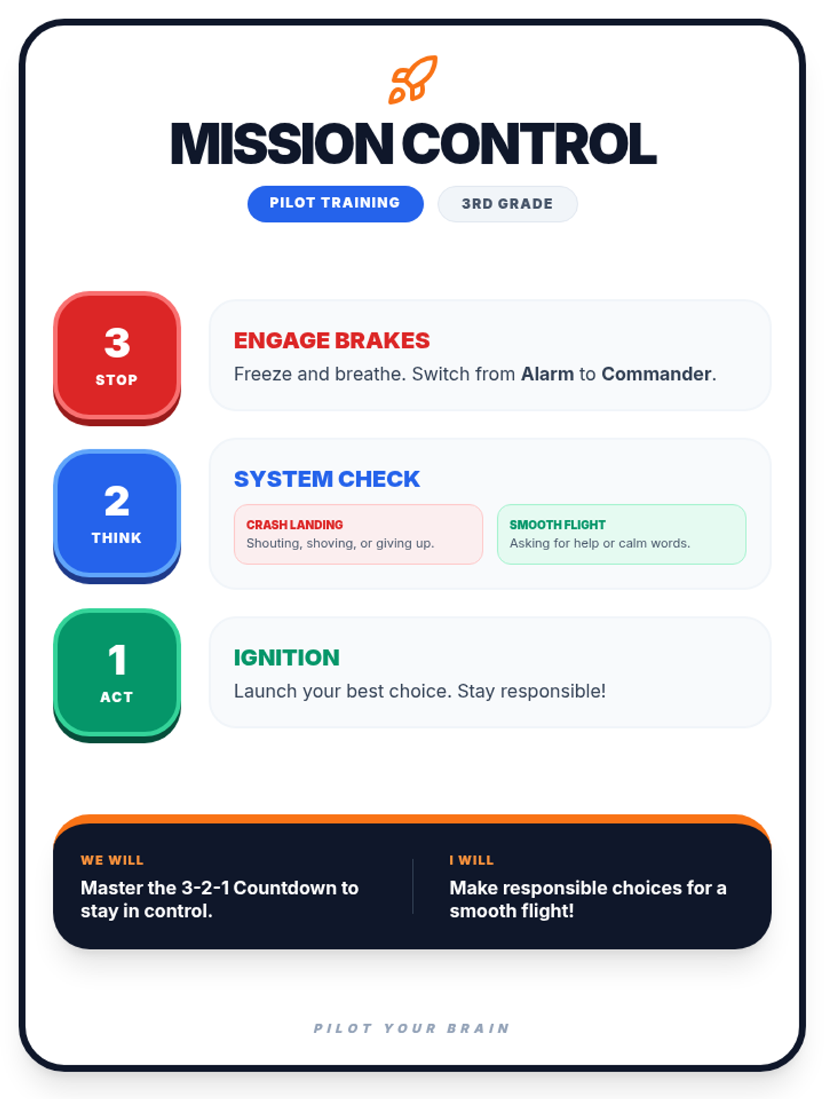 A space-themed classroom anchor chart detailing the 3-2-1 Countdown for self-regulation. Revised for printer-friendliness and single-page fit. Now includes explicit 'Crash Landing' vs 'Smooth Flight' examples.