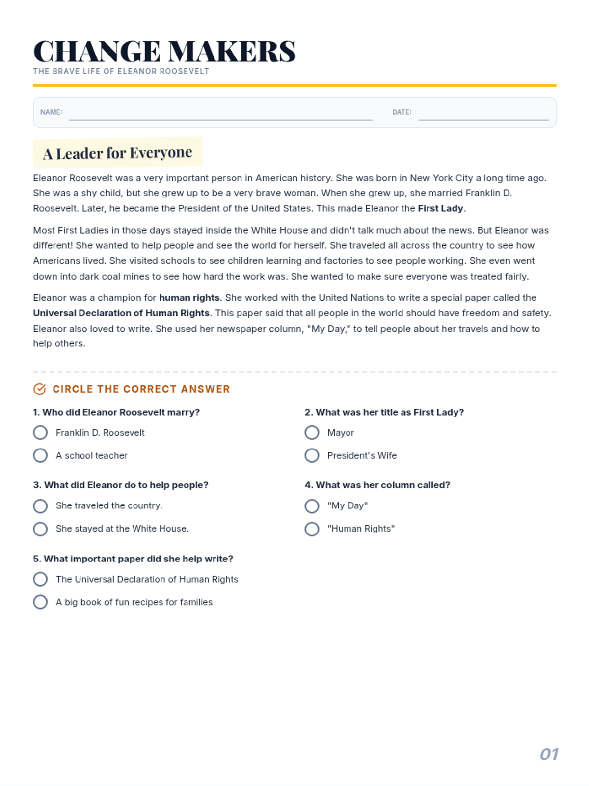 A 6-page activity packet featuring historical figures. Page 1 includes a 235-word reading passage on Eleanor Roosevelt for second graders followed by 5 multiple-choice comprehension questions with large markers. Other pages include activities for Rosa Parks, MLK Jr., and more.