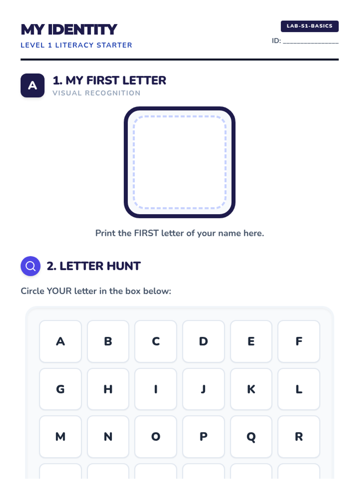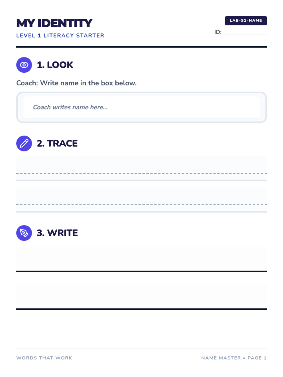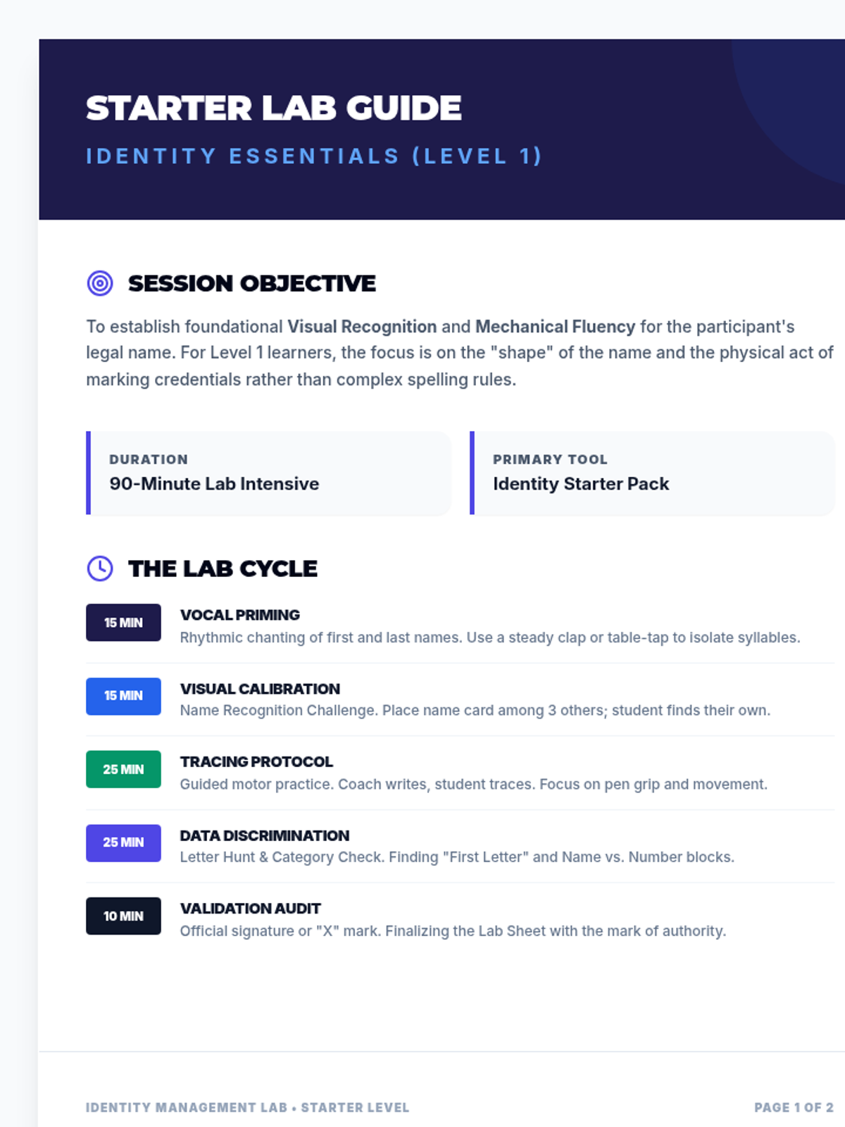 A modified Level 1 basics worksheet for adult learners, focusing on letter recognition and signature marking. This 2-page version excludes the general tracing page to allow for personalized name practice. Features high-visibility text, clear icons, and a clinical vocational aesthetic. Updated with full alphabet grid and improved work area sizing.