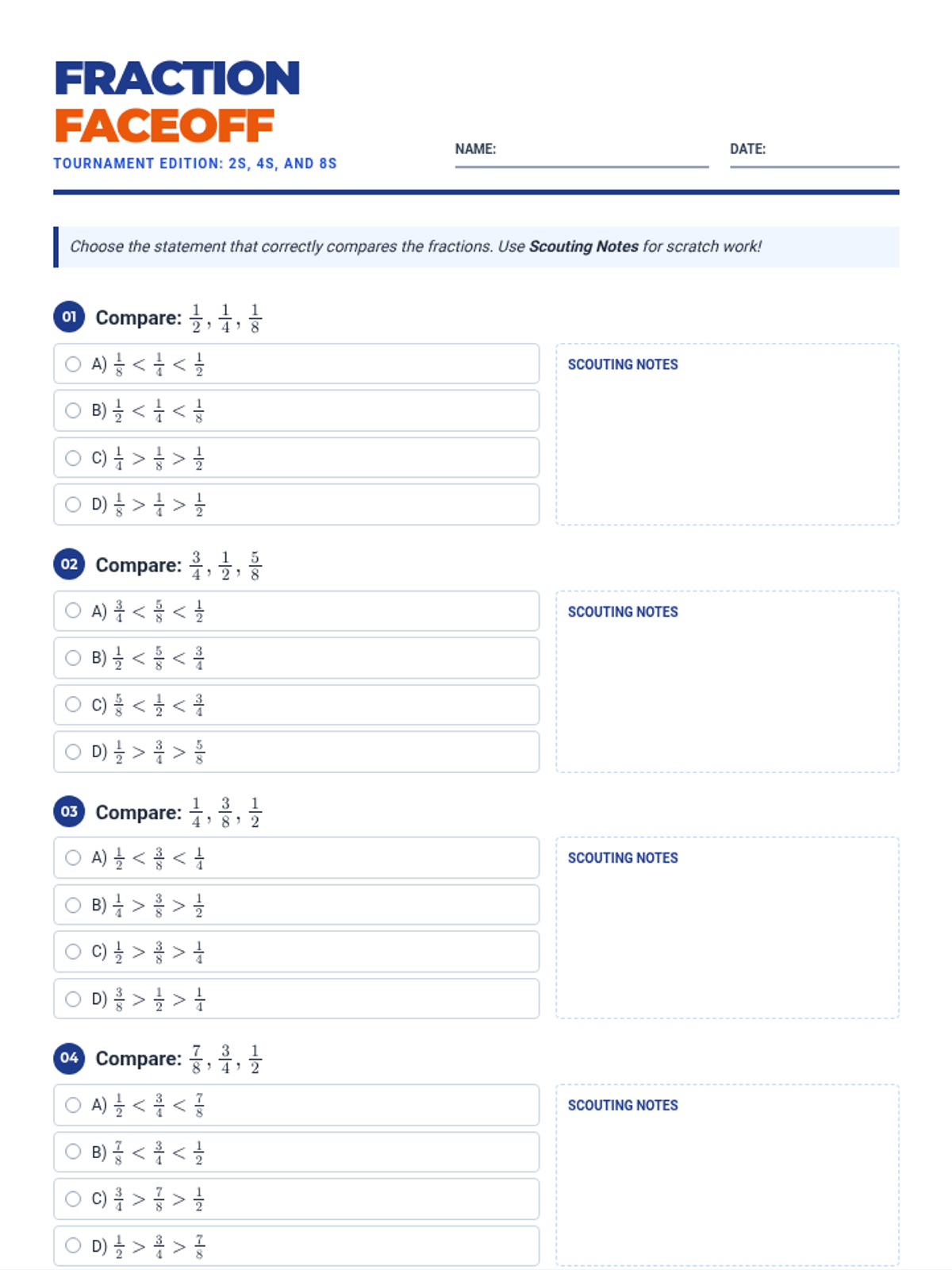 A sports-themed worksheet where students compare three fractions with unlike denominators (2, 4, 8) using inequality symbols. Includes a wider scouting notes area for student work and fixed layout.