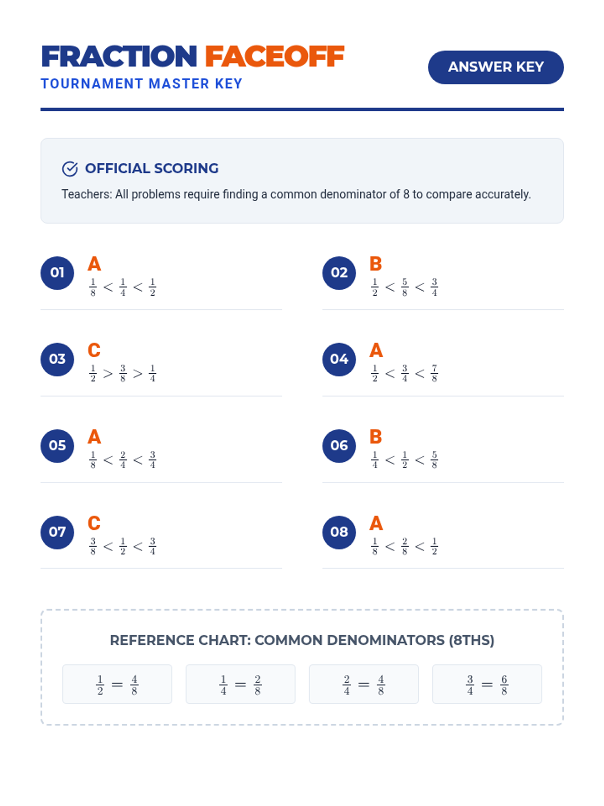 Answer key for the Fraction Faceoff Worksheet, including a reference chart for converting denominators to 8ths. Includes improved contrast and layout stability.