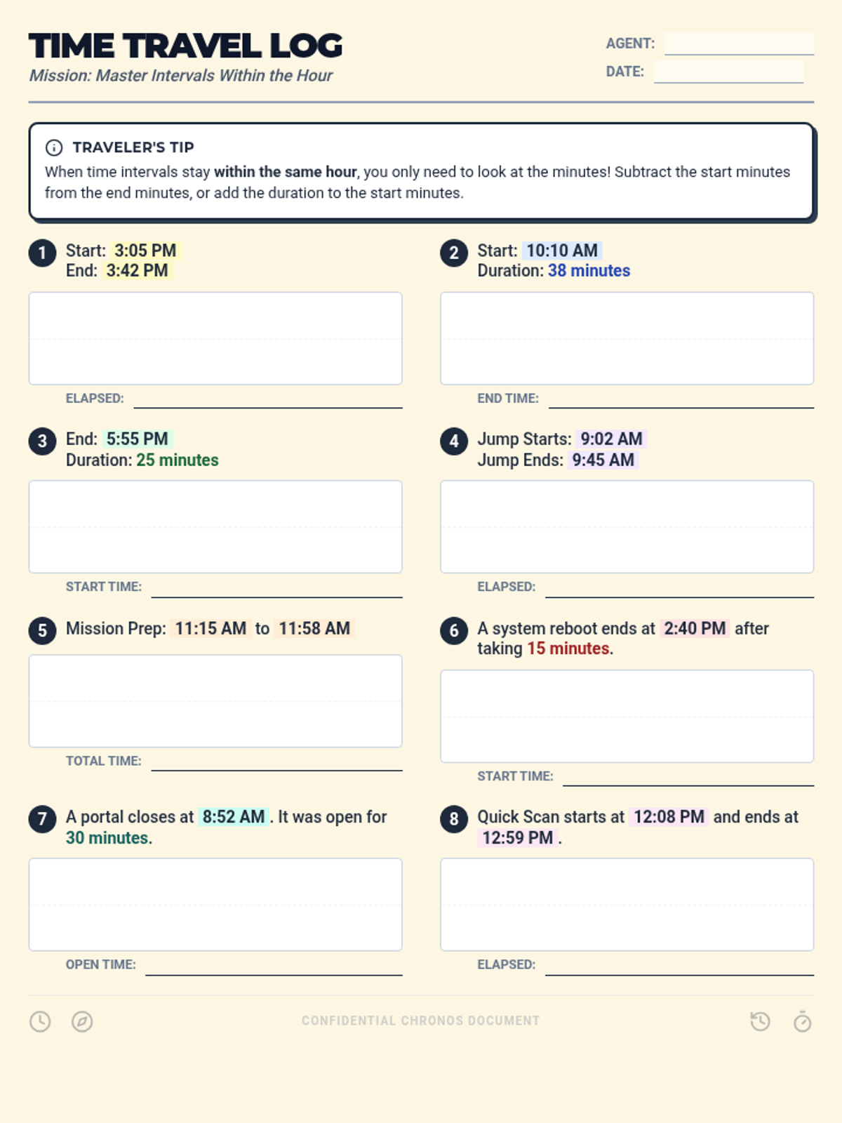 A revised "Time Travel Log" worksheet focused on addition and subtraction of time intervals within the same hour, featuring eight thematic word problems and work areas.