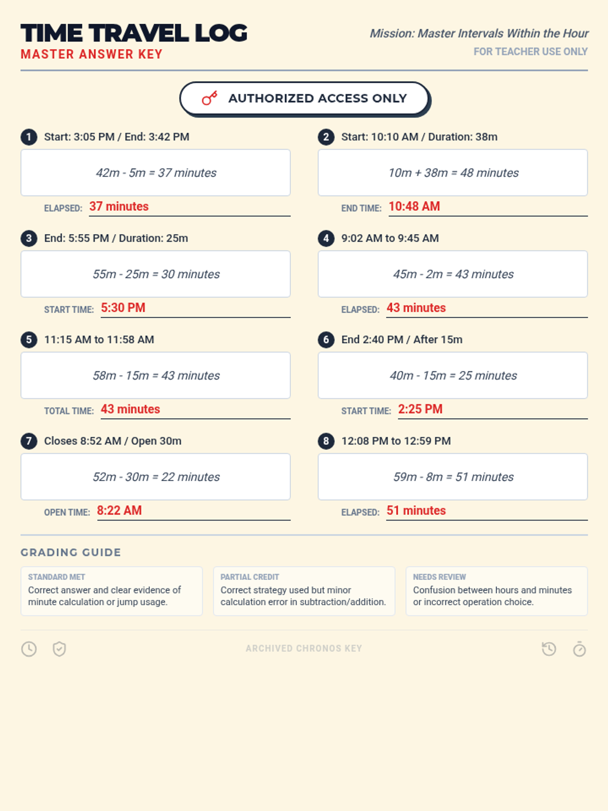An answer key for the Time Travel Log worksheet, providing calculated solutions and a simple grading rubric for teachers.