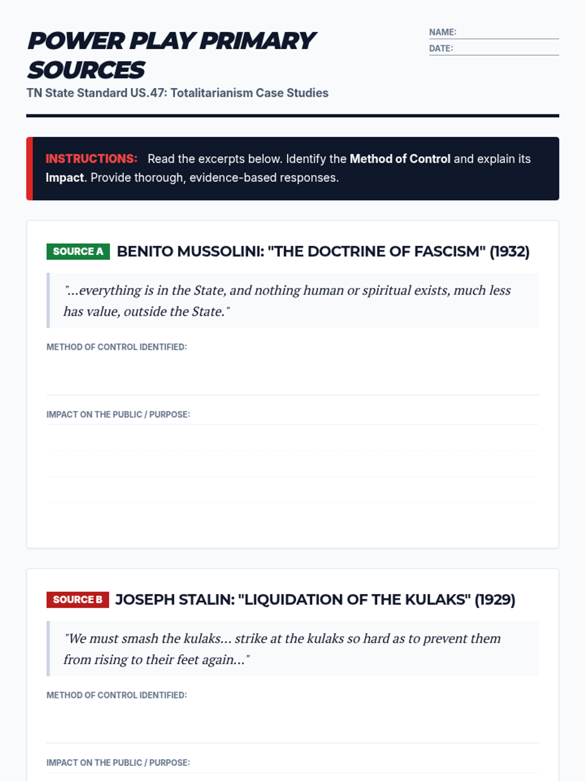 A primary source document set featuring excerpts from Mussolini, Stalin, Hitler, and Tojo, with analysis questions for high school students. Every source includes author names and publication years.