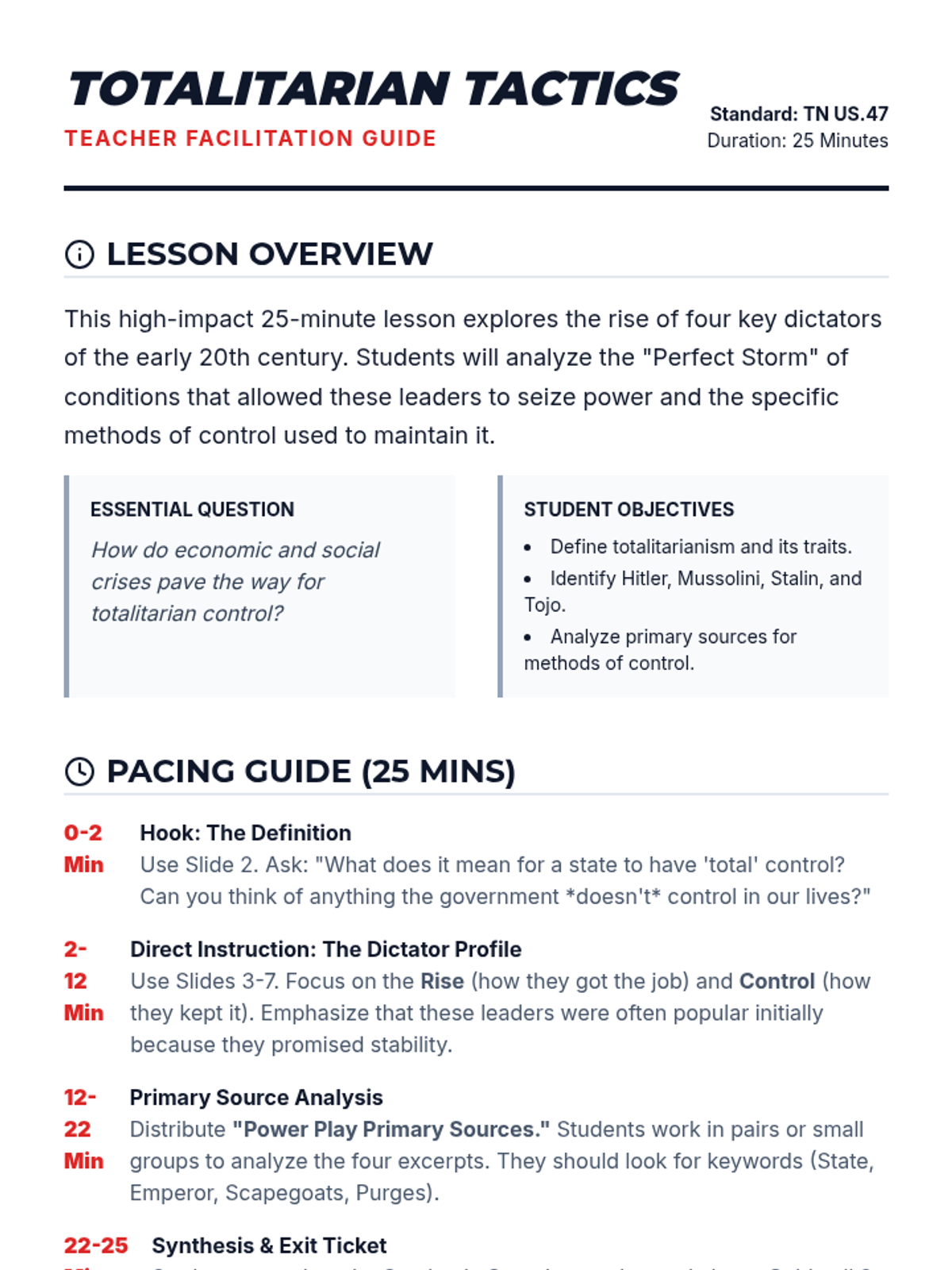 A teacher guide for the "Iron Grip" lesson, featuring a 25-minute pacing guide, primary source answer key, and instructional tips for high school history teachers.