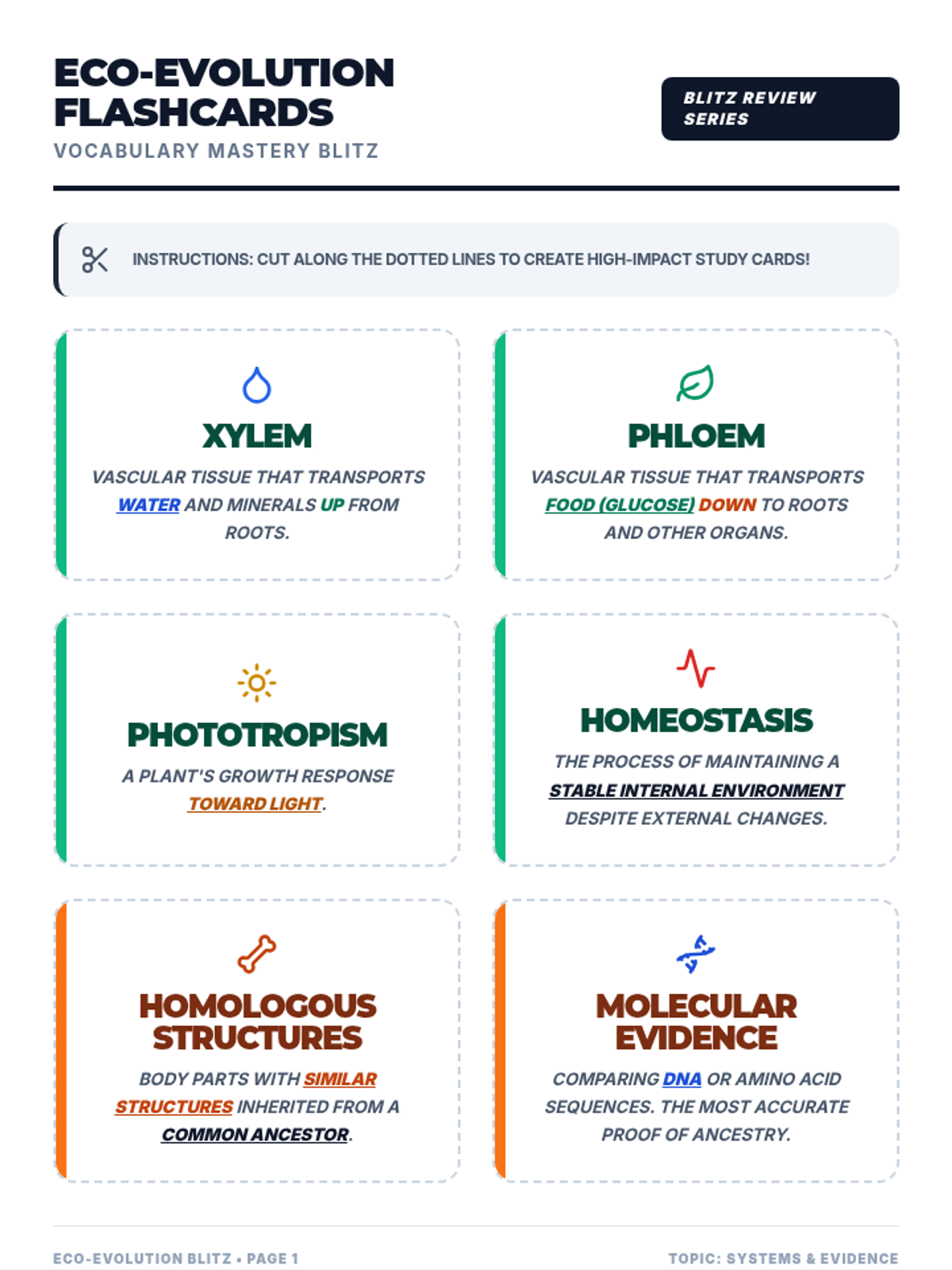 A 3-page set of printable vocabulary flashcards covering key terms for ecosystem stability, mechanisms and evidence of evolution, and plant and animal systems. Each card features a bold term, a concise definition aligned with STAAR standards, and a visual icon, all styled within a clean grid for easy cutting.