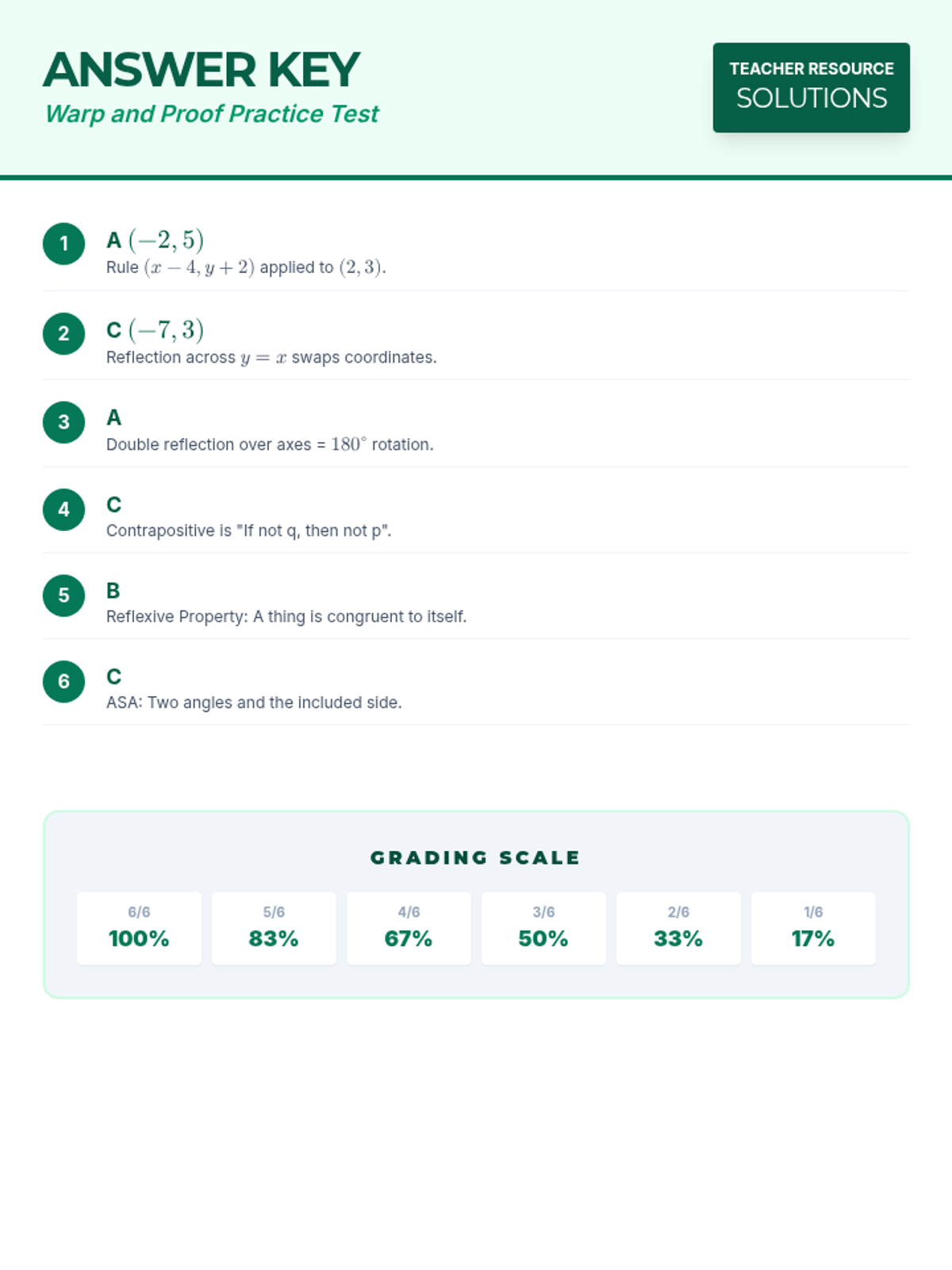 The teacher answer key for the Warp and Proof Practice Test, including correct answers and brief instructional explanations.