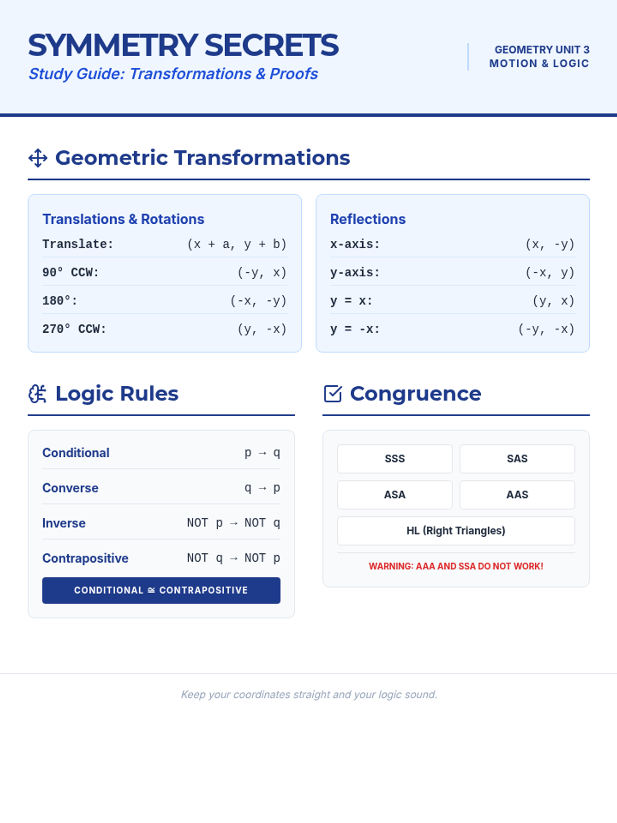 A comprehensive study guide summarizing geometric transformations (isometries and dilations) and the fundamentals of logical reasoning and triangle congruence proofs.