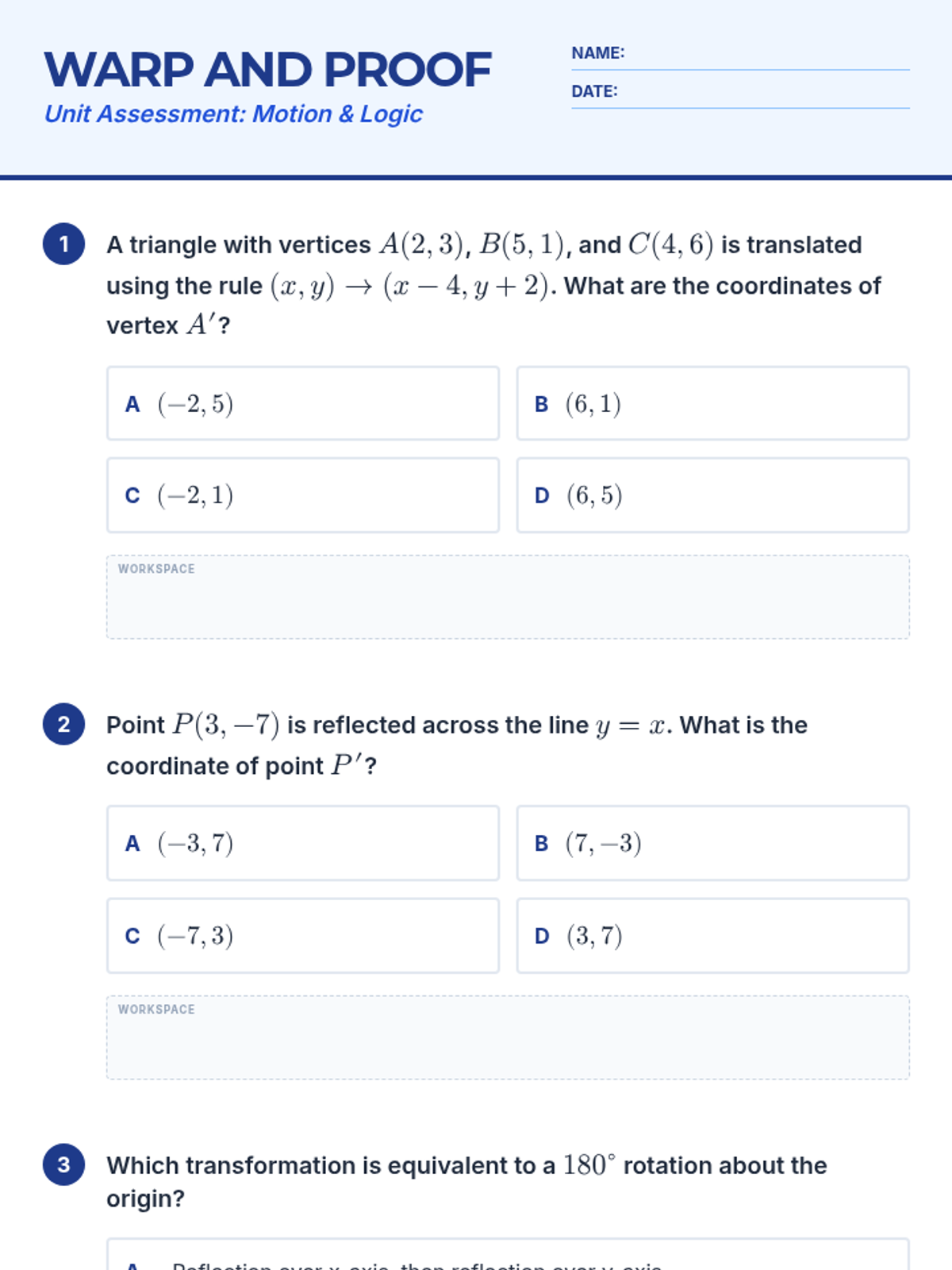 A multiple-choice practice test covering coordinate transformations (translations, reflections, rotations) and introductory geometric logic and triangle congruence proofs.