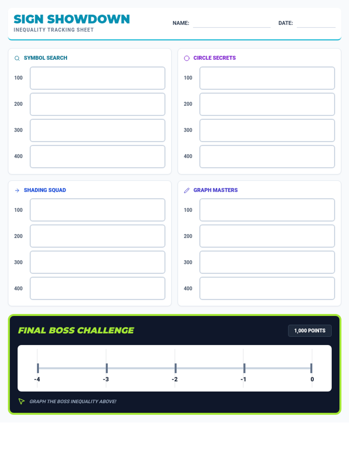 A printable tracking sheet for students to record their answers during the Sign Showdown jeopardy game, featuring clear sections for each category and a dedicated workspace for the final challenge graph. Optimized to fit on a single page with larger response areas for IEP students.