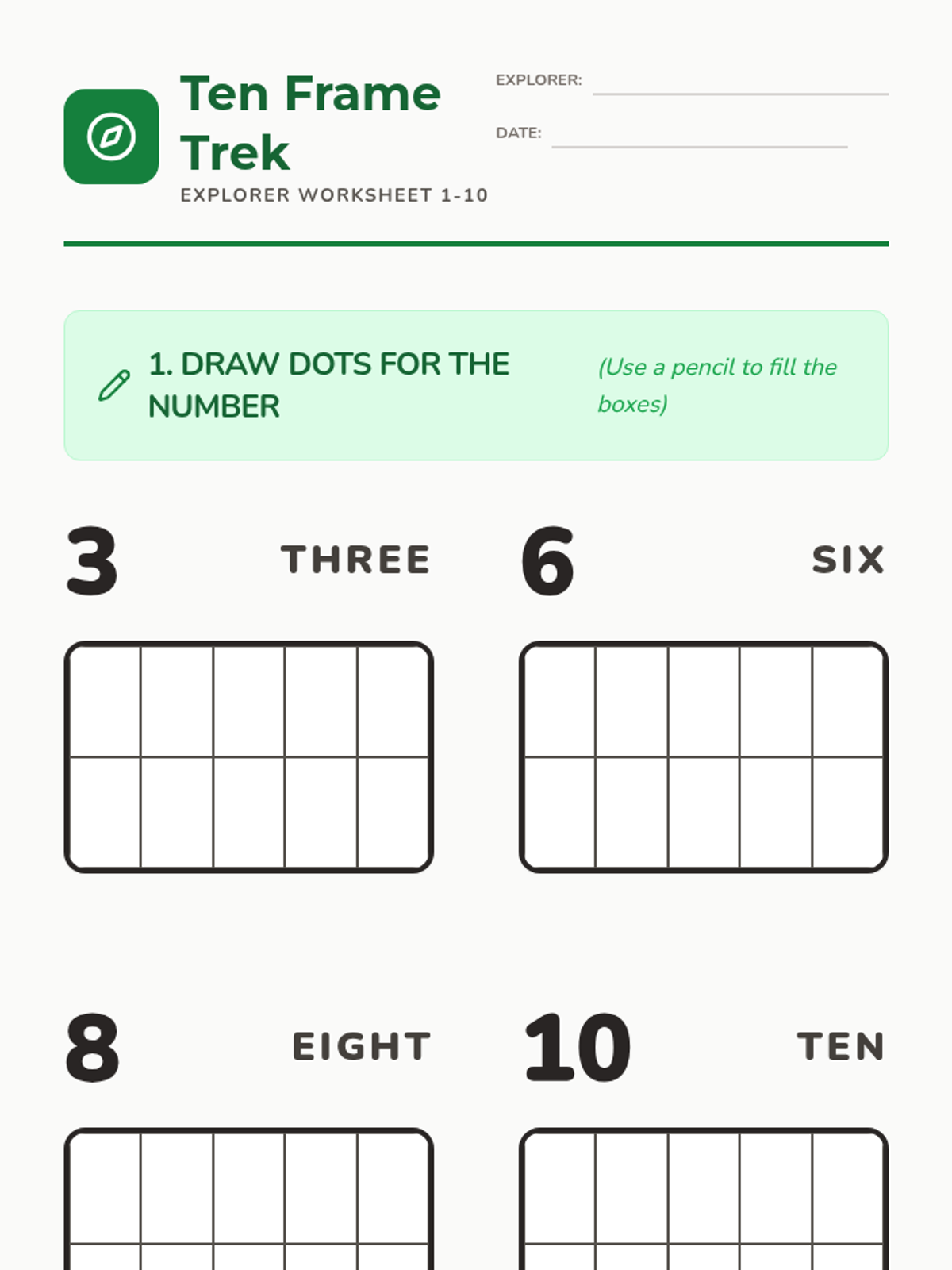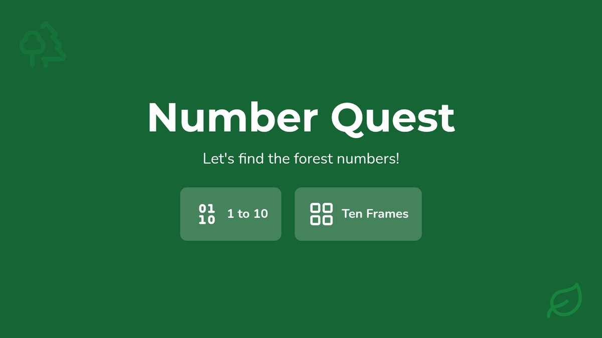 A visually engaging slide deck for Kindergarten MLL students introducing numbers 1-10 using a forest explorer theme and ten frames. Includes all numbers 1-10 with large visuals, clear numerals, and scaffolds for oral language development.