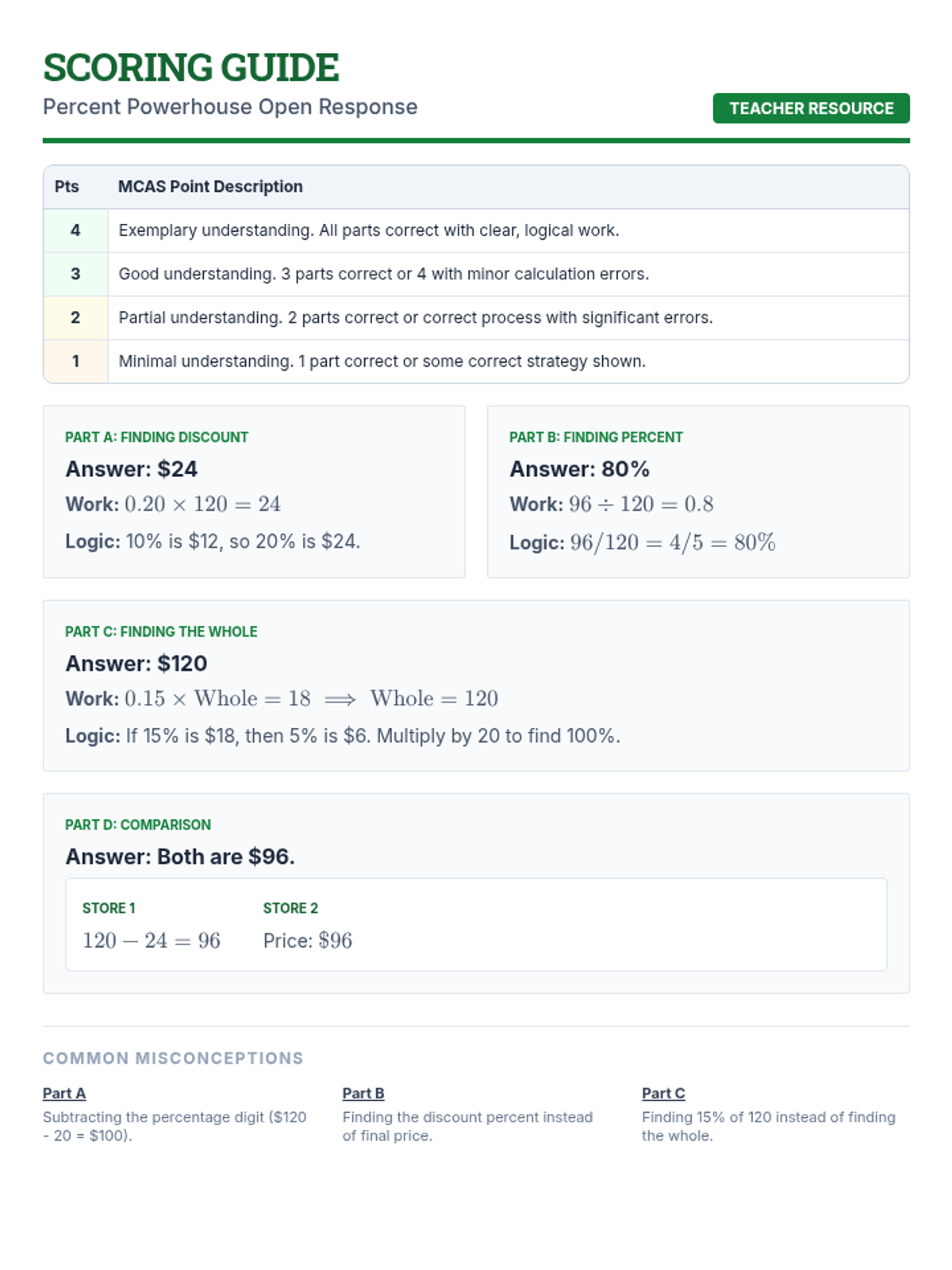 A detailed teacher scoring guide and answer key for the Percent Powerhouse open response, including a 4-point MCAS-aligned rubric and step-by-step solutions for each part.