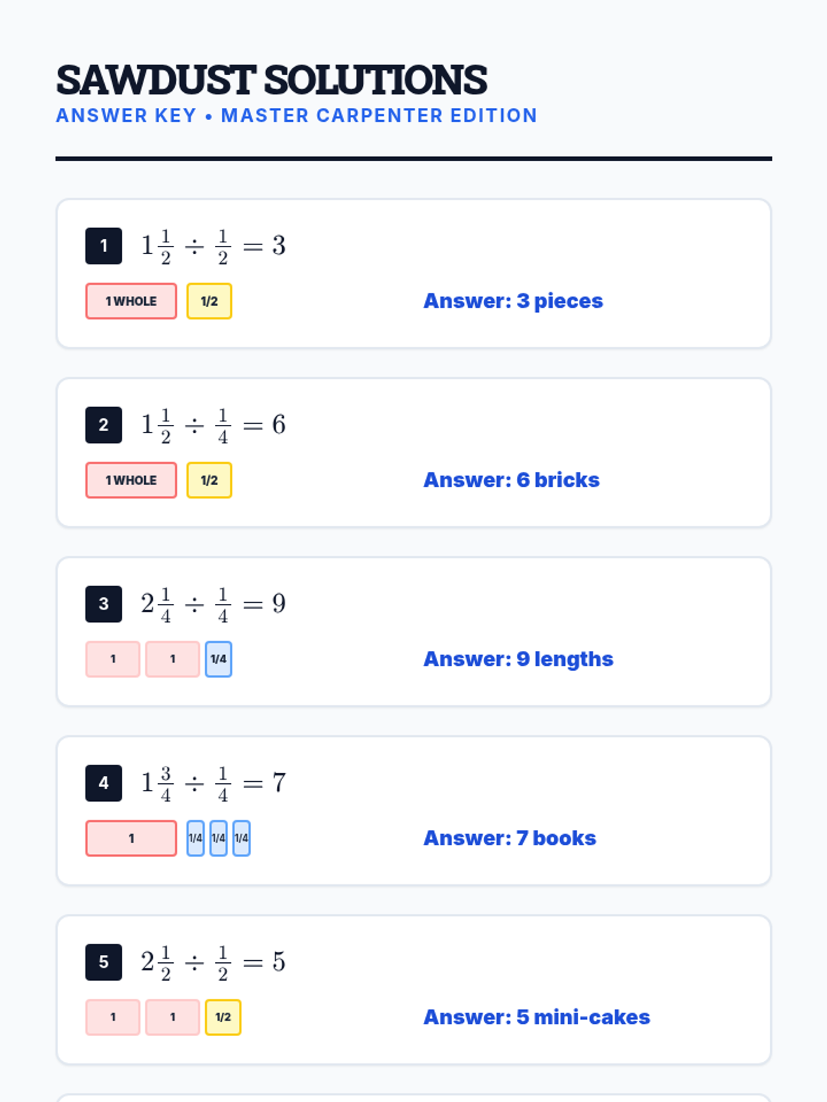 Answer key for the Sawdust Solutions worksheet. Improved layout and visual consistency for all problems. Added explicit tile labels.