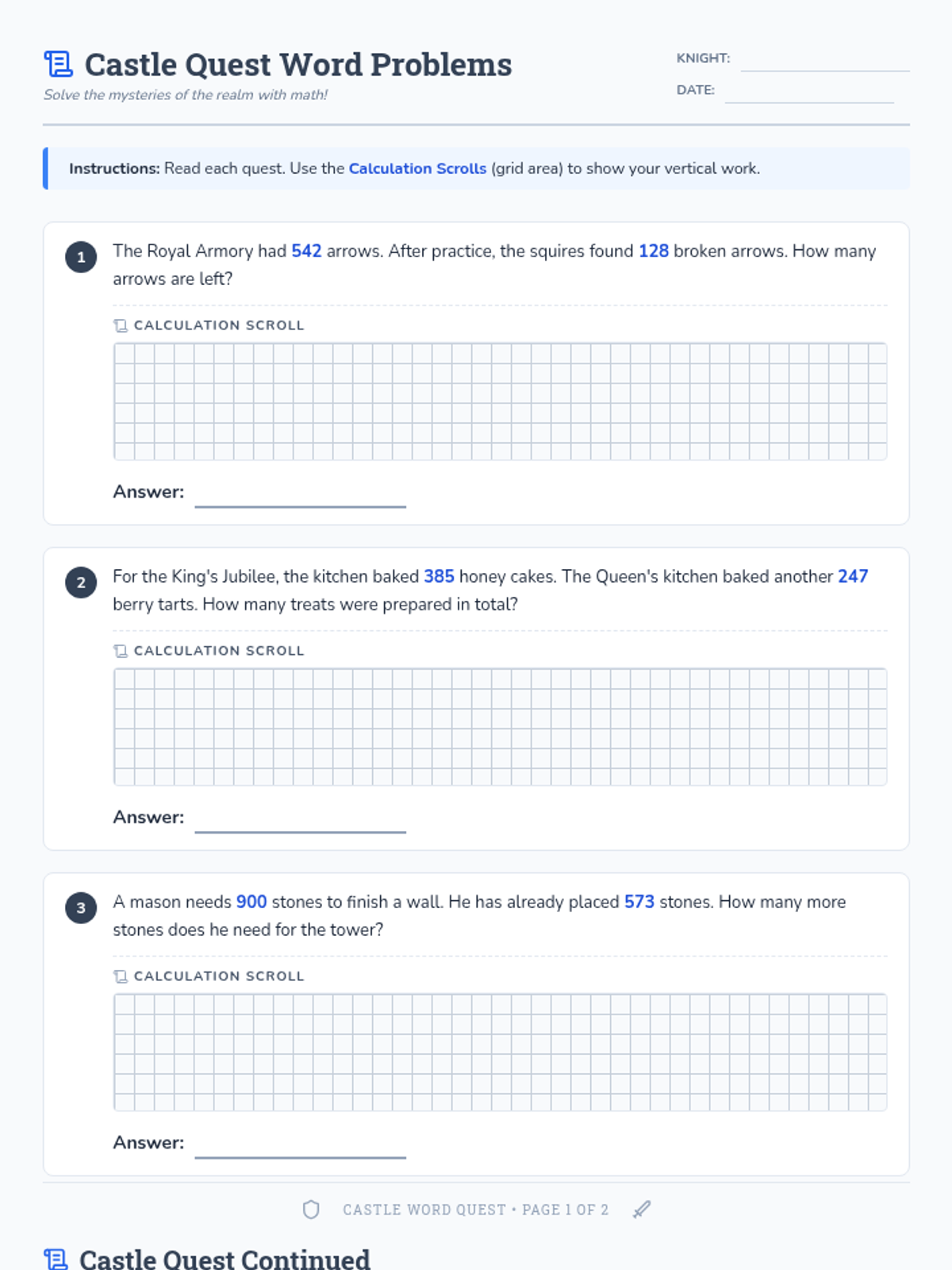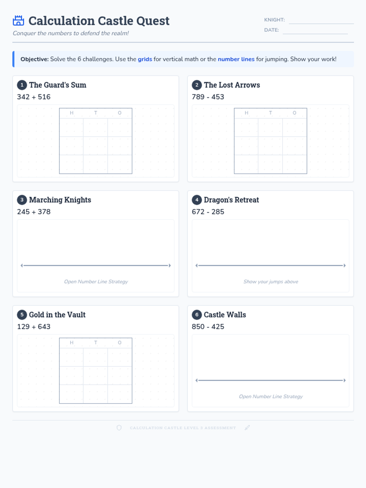 A medieval-themed grade 3 math worksheet featuring six addition and subtraction problems up to 1000. It includes support tools like graph paper grids for vertical alignment and open number lines for strategic calculation.