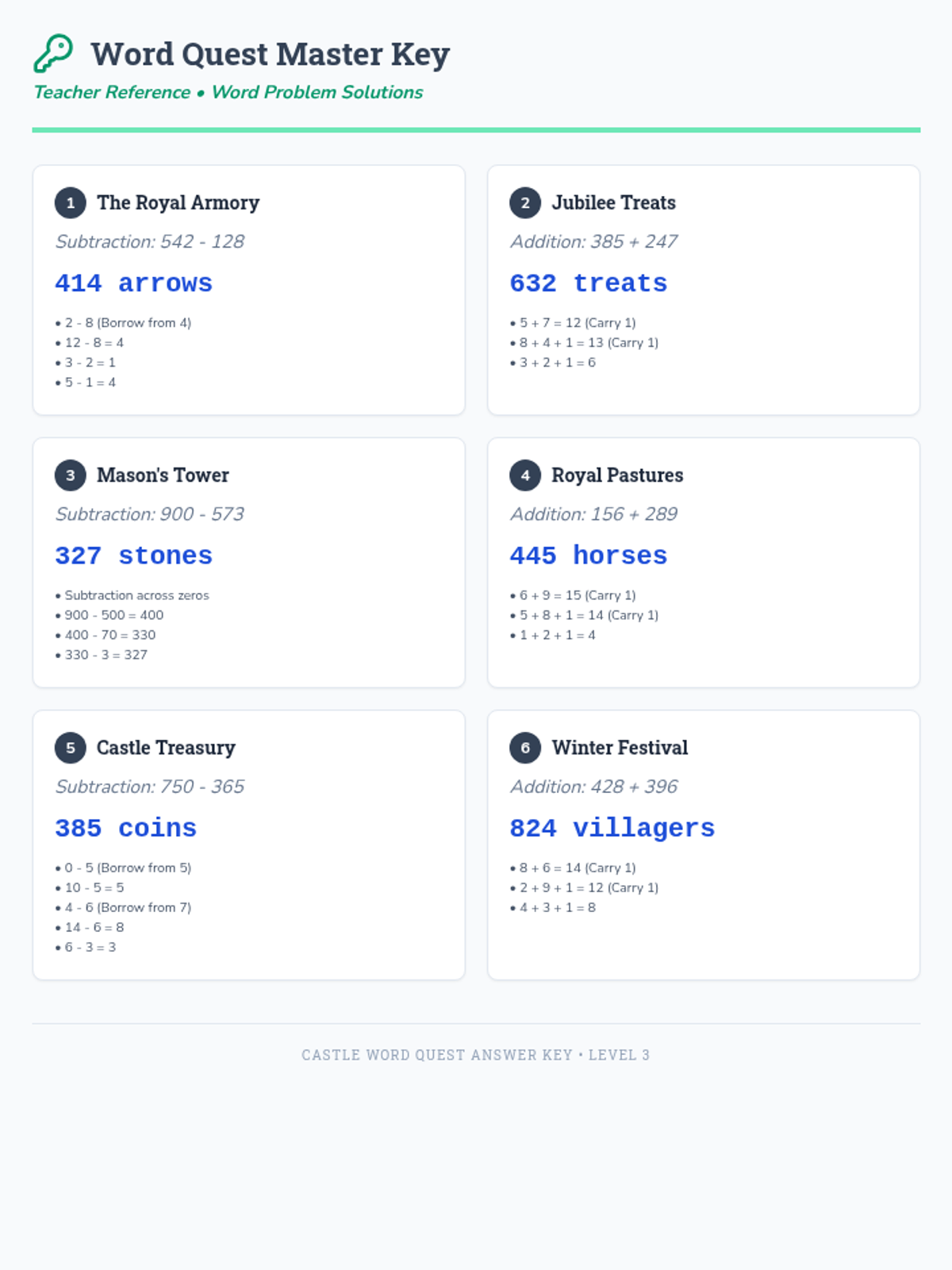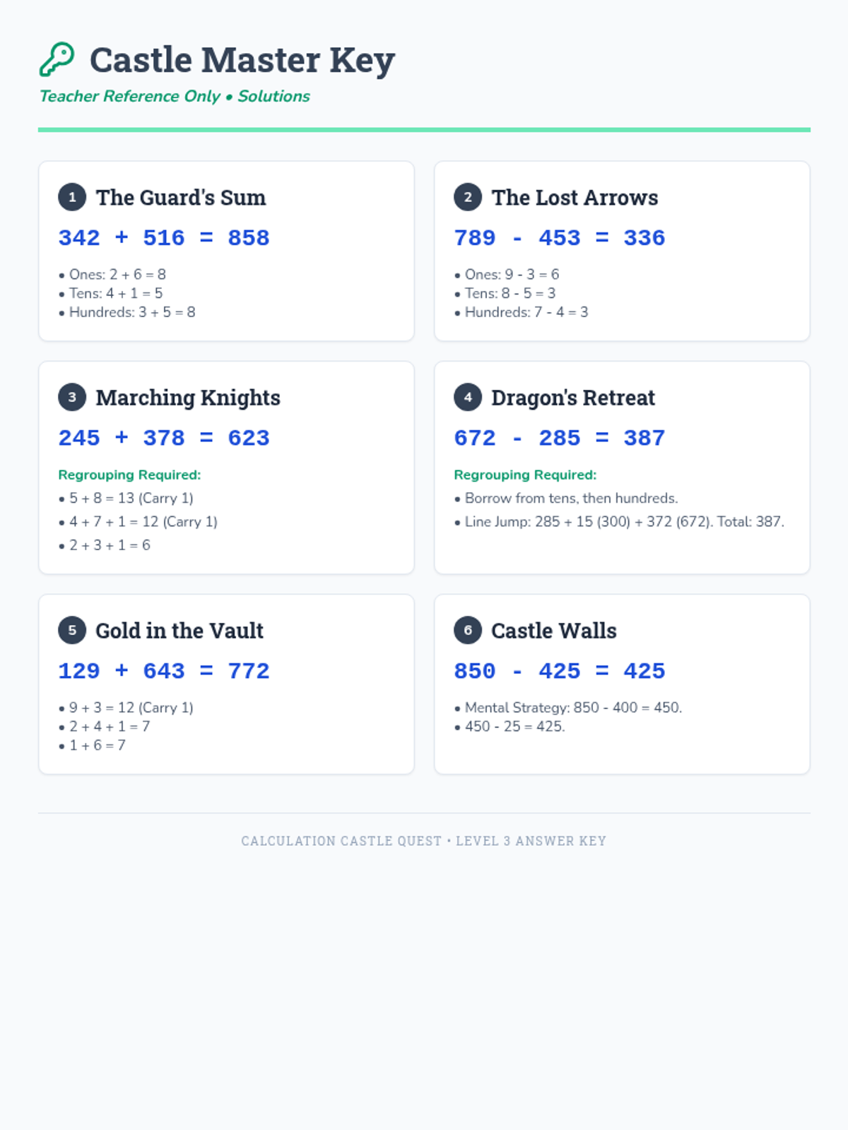 The answer key for the Calculation Castle Worksheet, providing solutions and step-by-step breakdown for addition and subtraction problems involving regrouping.