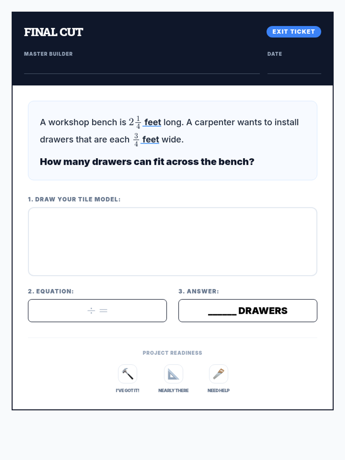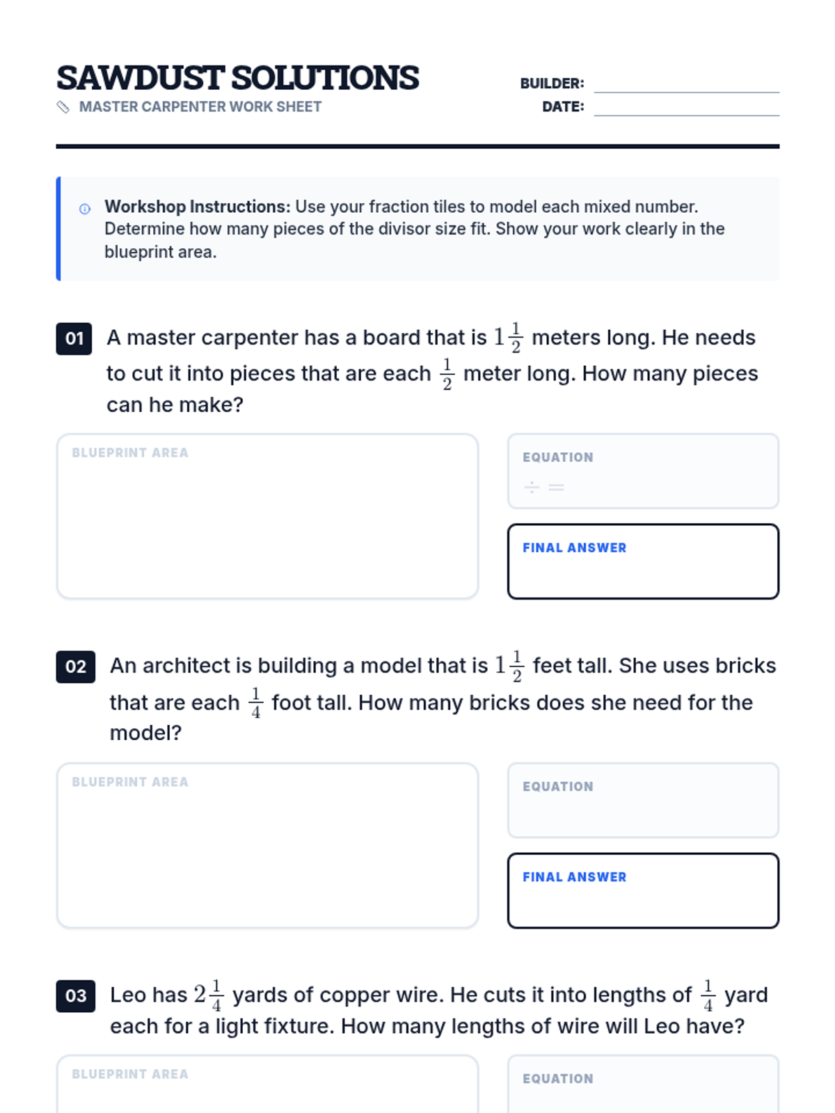 Instructional slides for teaching division of mixed numbers by fractions using visual models and fraction tiles within a carpentry-themed context. Now includes all 8 practice problems and exit ticket preview.