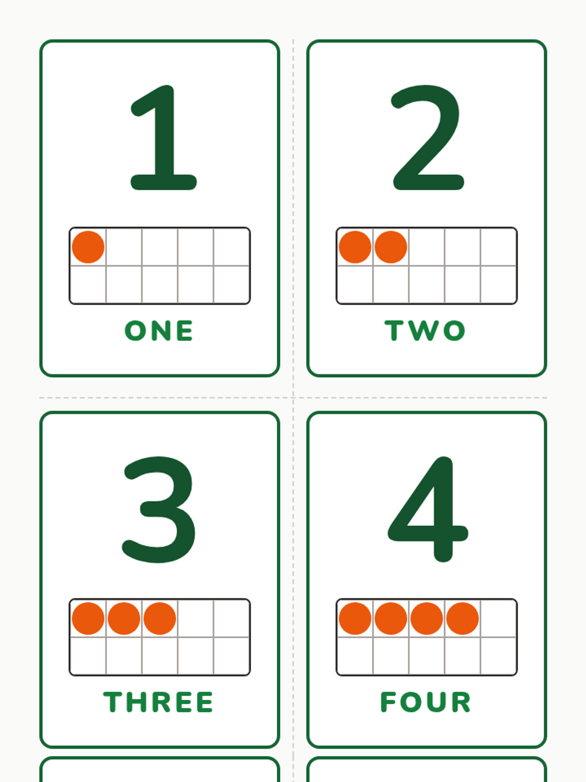 Large, high-contrast flashcards for numbers 1-10 featuring the numeral, a corresponding ten frame, and the number word. Includes cutting guides and dark grid lines for visibility. Ideal for matching games and MLL vocabulary building.