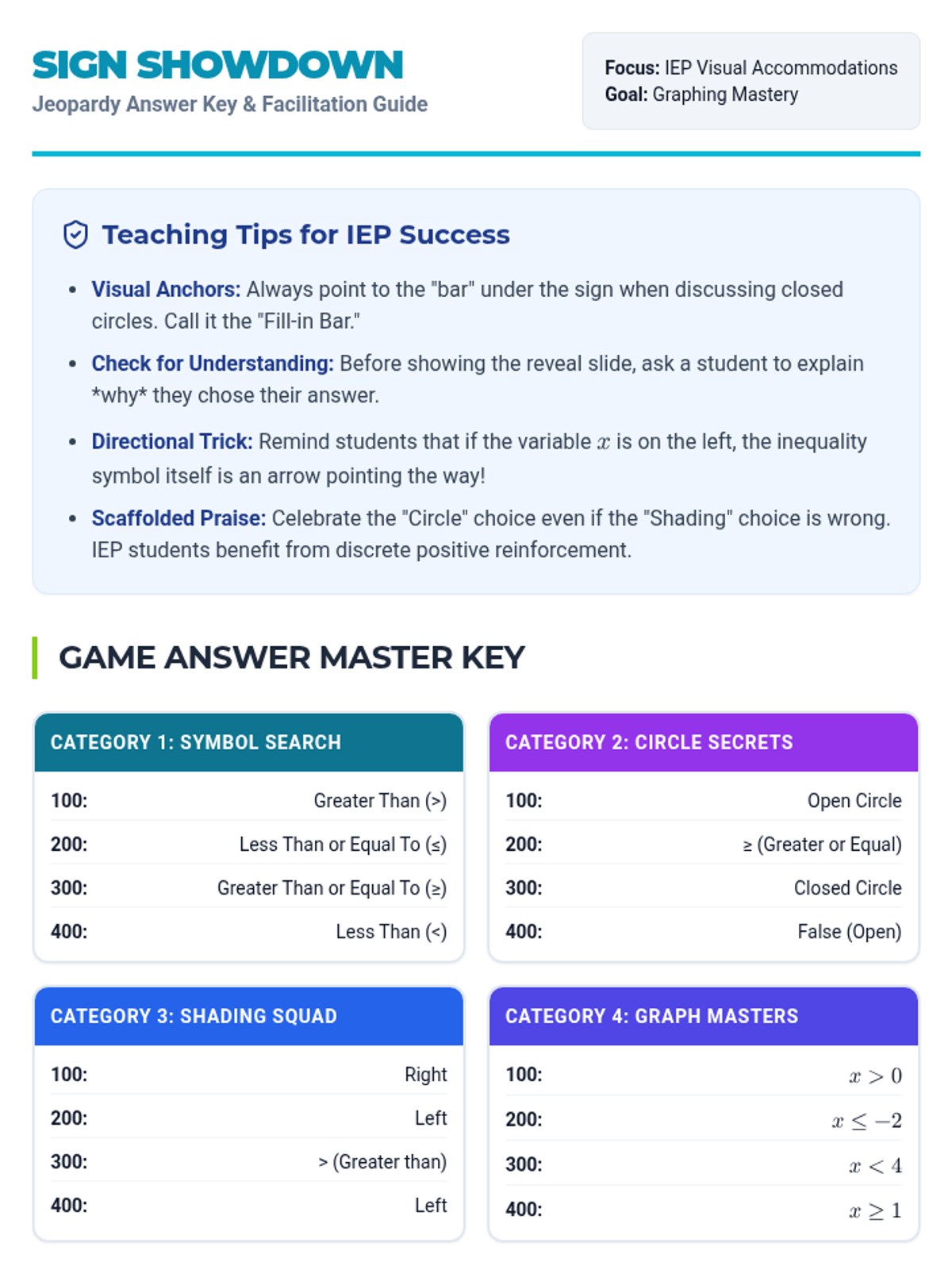 A comprehensive teacher's guide and answer key for the Sign Showdown game, featuring instructional strategies for IEP students and clear answers for all jeopardy categories. Now with fixed page breaks and high-quality visual answer keys.