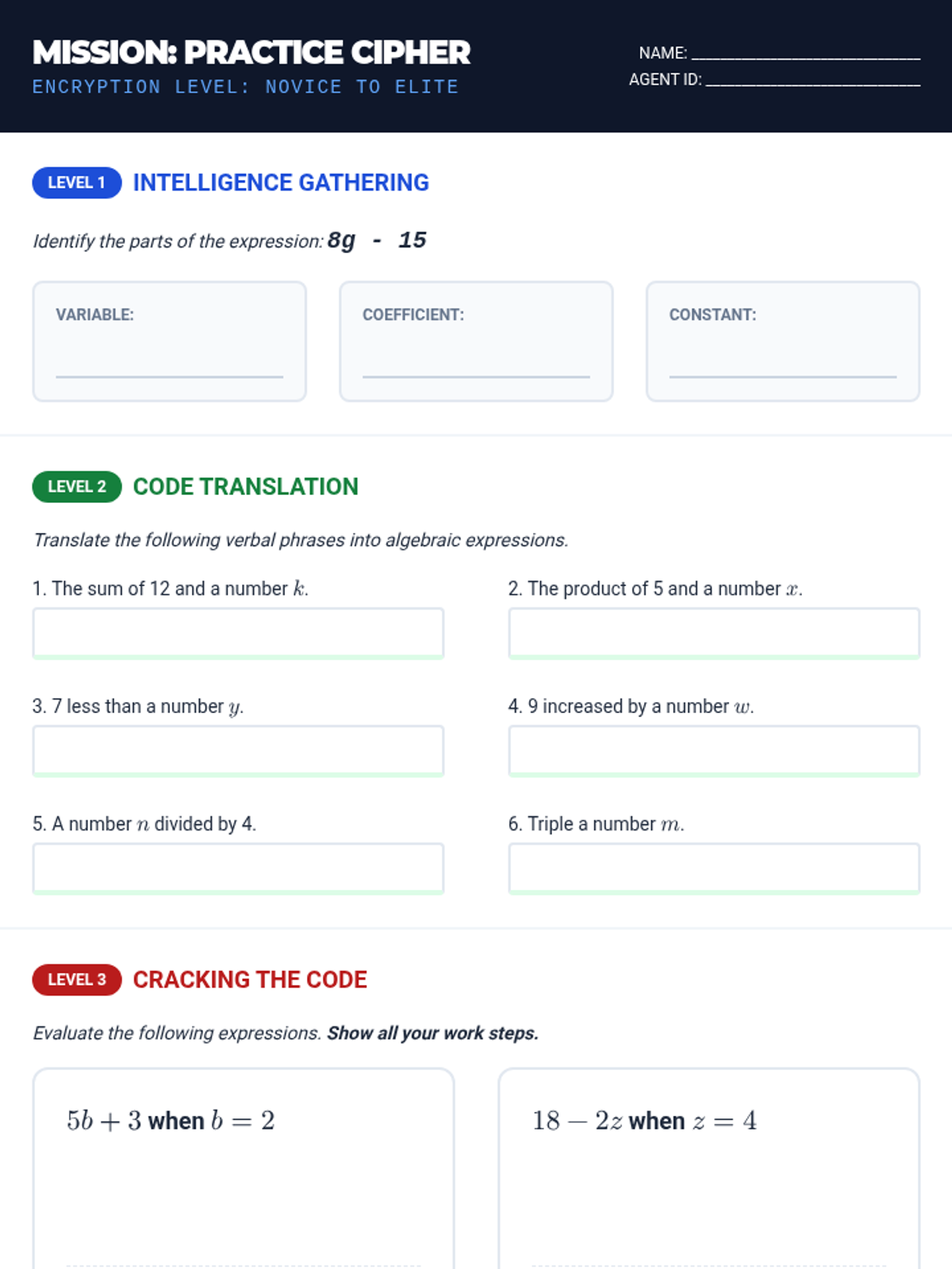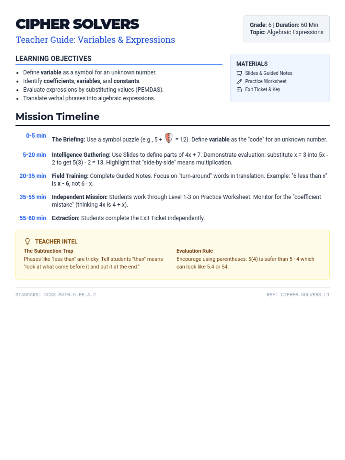A comprehensive teacher's lesson plan for 6th-grade variables and expressions, featuring a secret agent theme, clear learning objectives, and a 60-minute instructional timeline. Condensed to fit a single page for teacher convenience. Variable notation used standard characters for maximum compatibility.