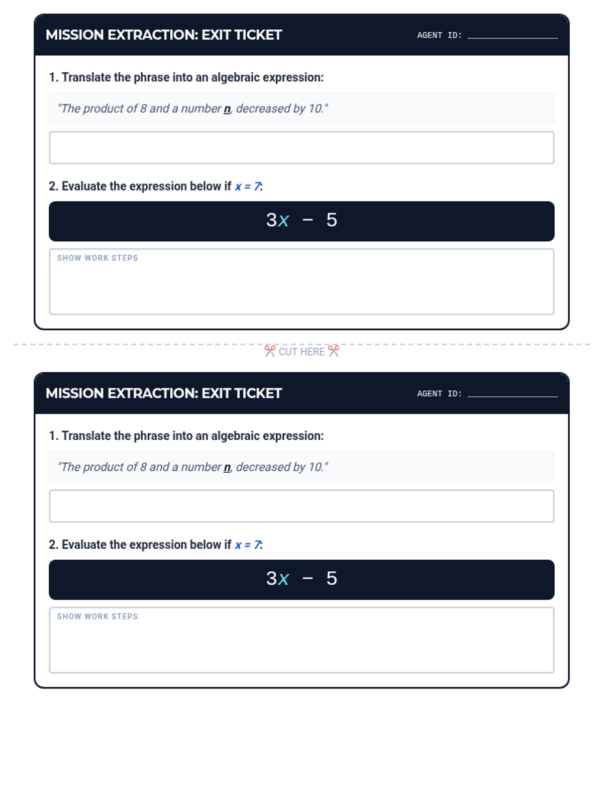 Two-per-page exit ticket revised for single-sheet printing. Height and padding adjusted to ensure both copies fit correctly. LaTeX formulas and work areas optimized for clarity.
