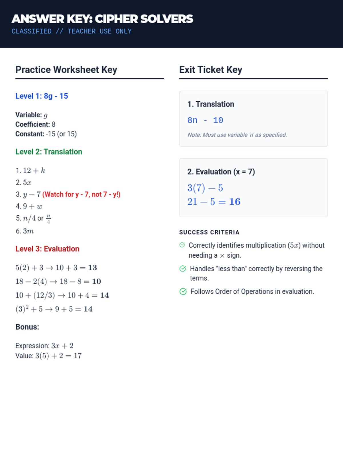 A teacher-facing answer key for all practice problems and exit tickets, including common misconception alerts and success criteria.