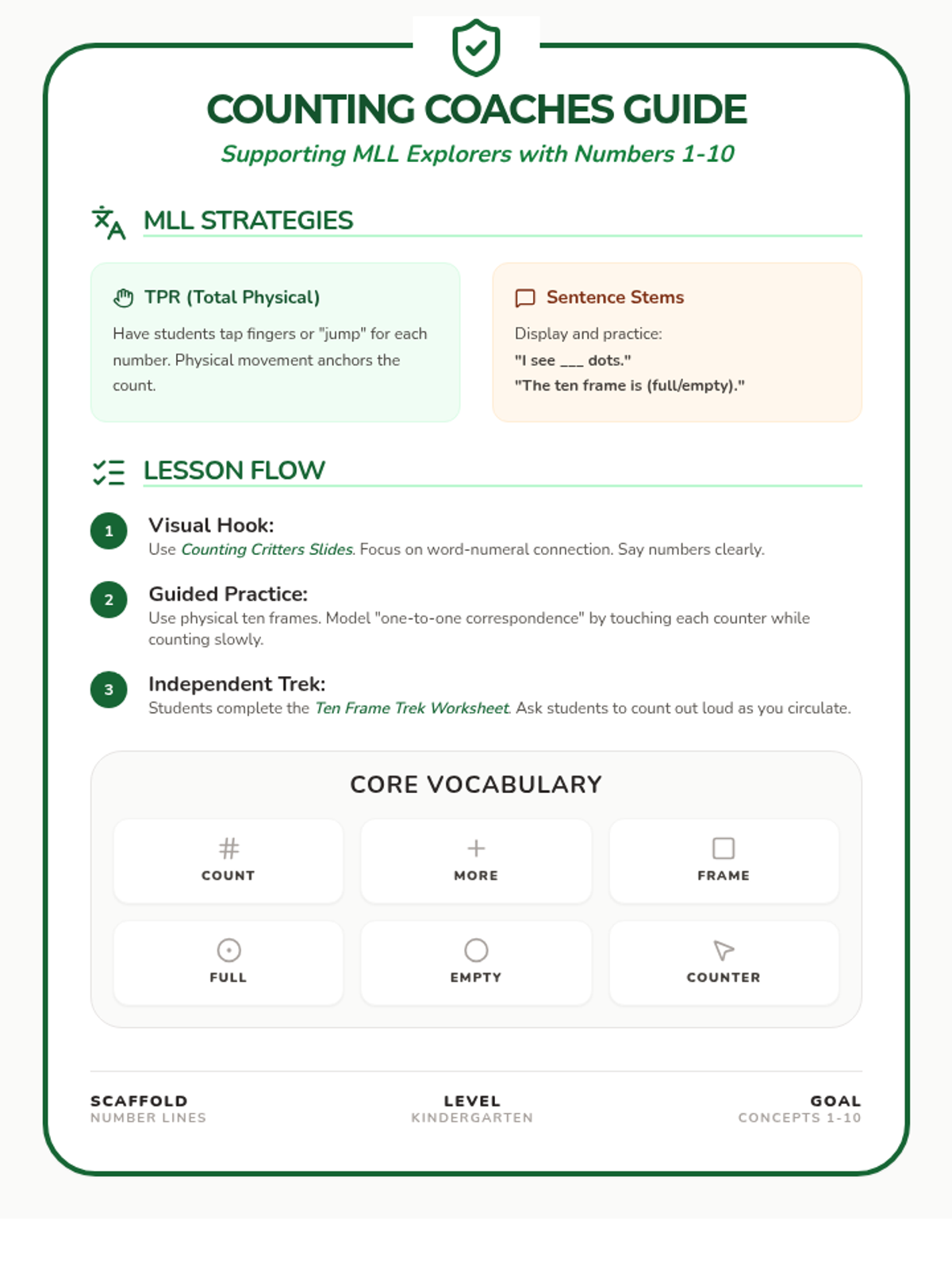 A comprehensive teacher guide providing MLL-specific instructional strategies, a lesson flow, and core vocabulary for teaching number concepts 1-10 with ten frames. Optimized for single-page 8.5x11 printing.