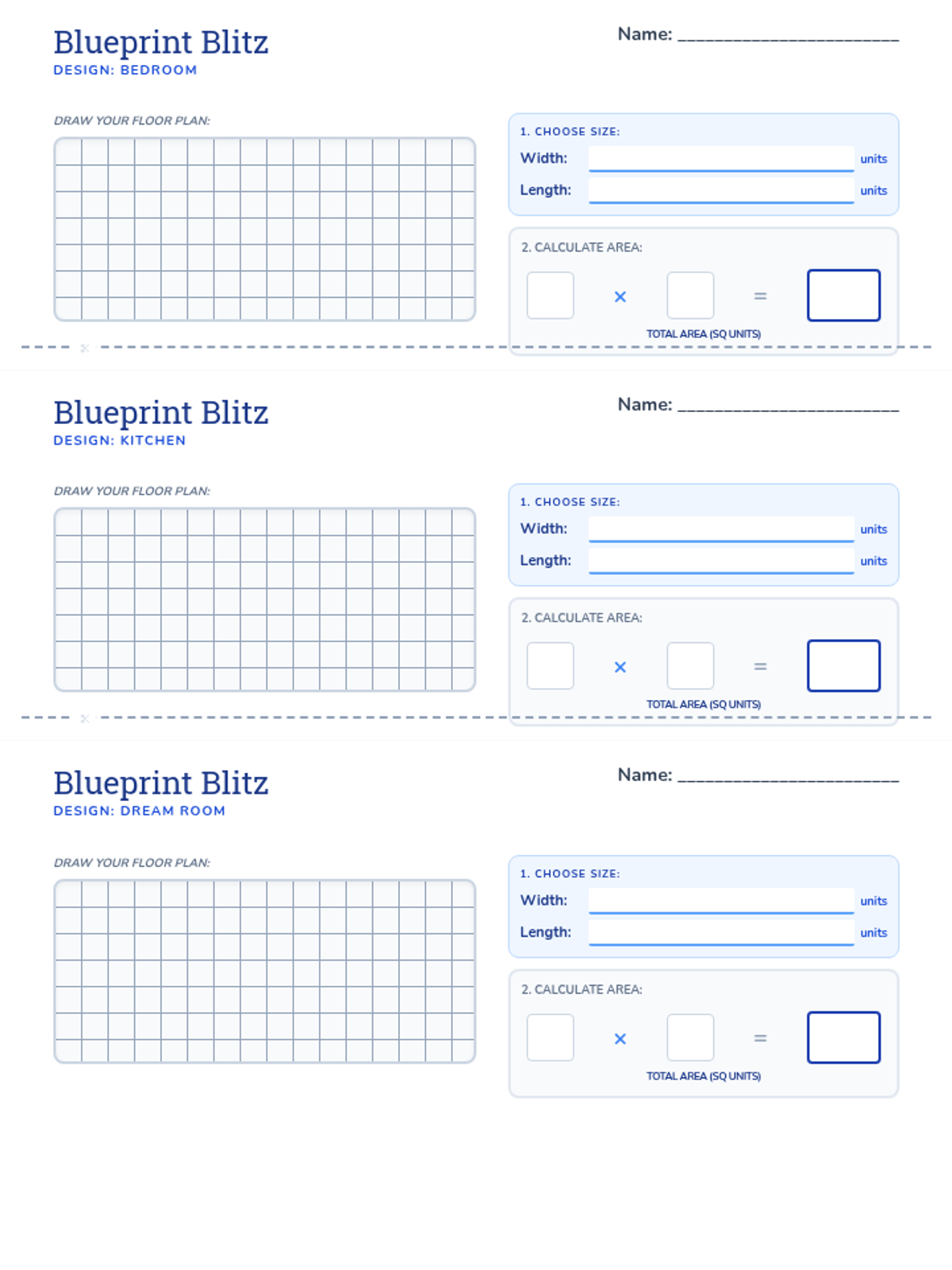 A "design your own room" version of the architect-themed exit ticket. Students choose their own dimensions for a bedroom, kitchen, and dream room, draw the floor plan on a 20px grid, and write the corresponding multiplication equation to find the area.