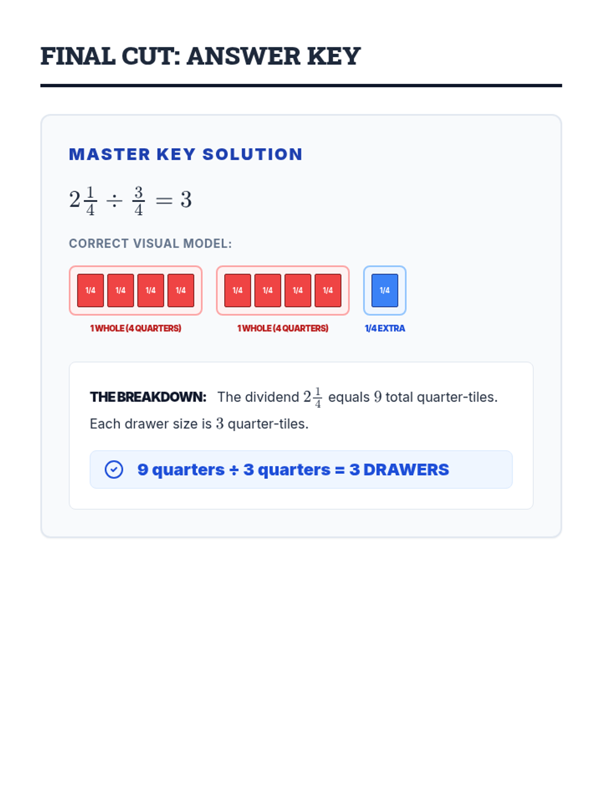 Answer key for the Final Cut exit ticket, detailing the visual model and division steps with improved clarity and accuracy. Fixed spacing in text header.