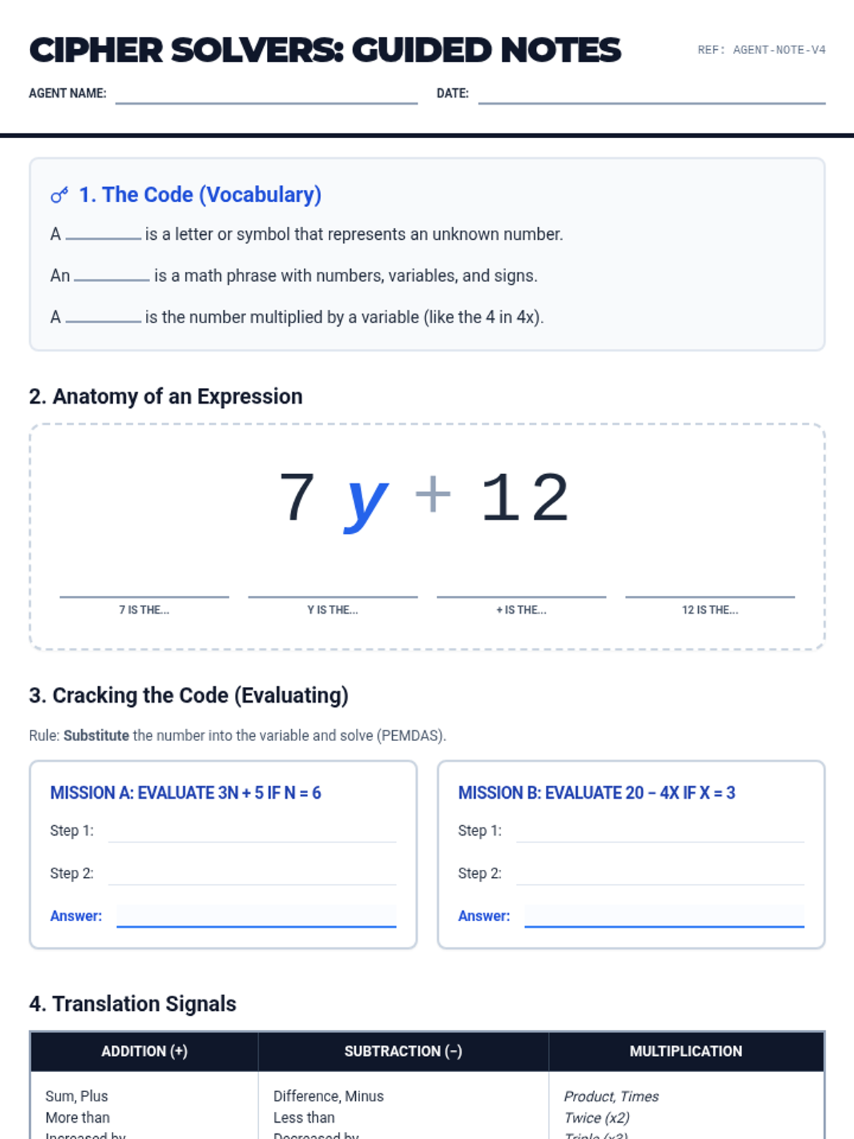 Student-facing guided notes with improved LaTeX visibility, darkened writing lines, and clear labeling for expression anatomy. Revised to prevent content clipping and improve contrast.