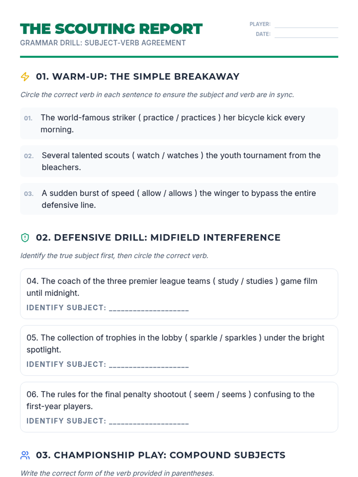 A soccer-themed worksheet for targeted grammar practice, focusing on simple subjects, prepositional phrase interference, and compound subjects. Updated with fixed page breaks and improved workspace for student input.
