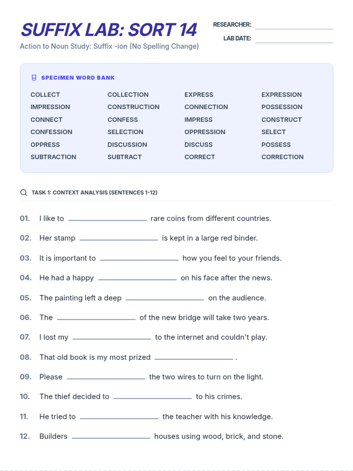A 3-page printable packet for Sort 14 (-ion). Includes 24 fill-in-the-blank sentences across two pages, followed by a logic page with 6 word unscrambles and a functional 12x12 crossword puzzle.