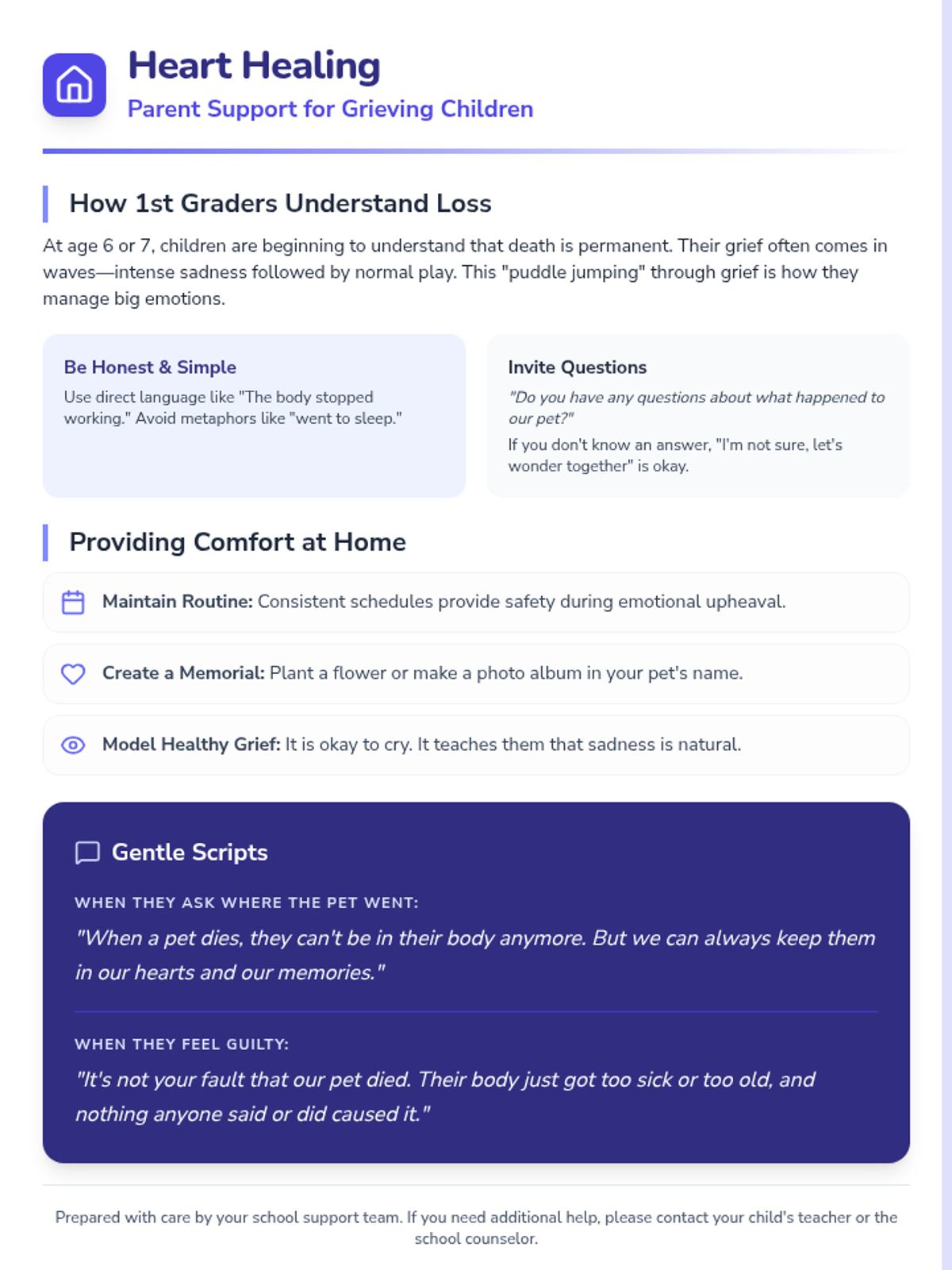 A supportive handout for parents and caregivers, offering developmental context, communication scripts, and home-based comfort strategies for children grieving a pet.