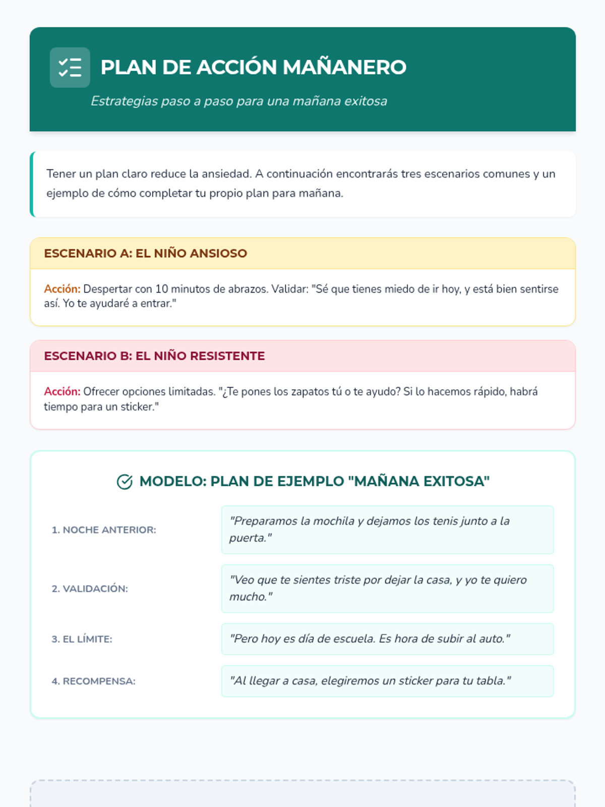 A Spanish action plan guide for parents providing specific scenarios and steps for handling morning routines and school refusal, including a customizable template with plenty of space for notes.
