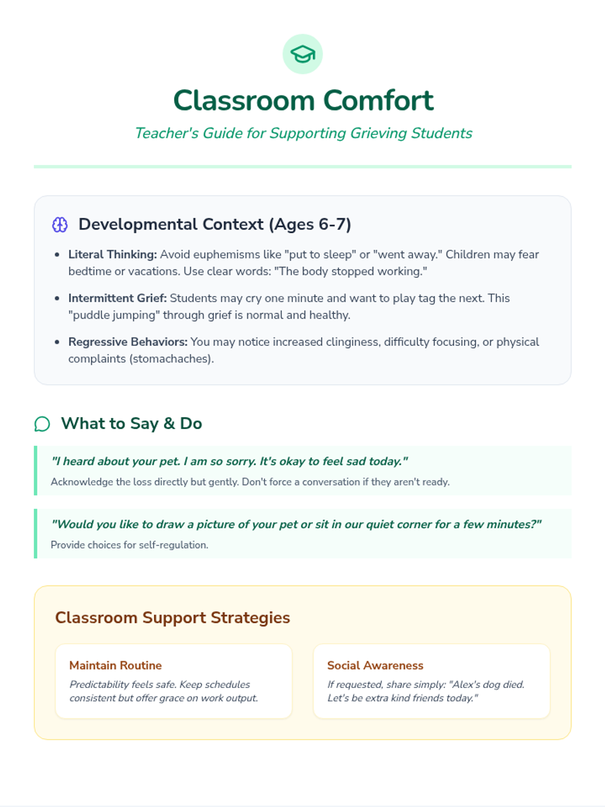 A comprehensive teacher guide providing developmental context, communication scripts, and classroom support strategies for educators helping a 1st-grade student through pet loss.