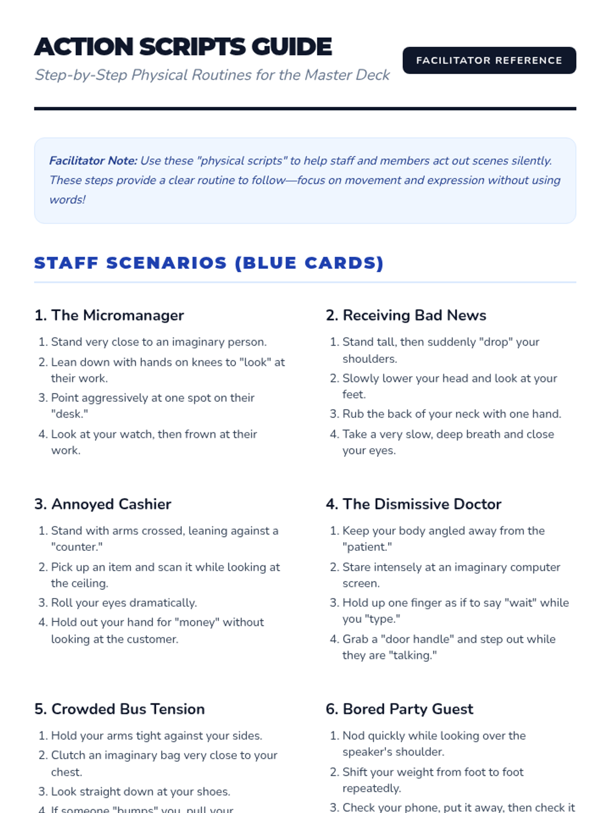 A step-by-step physical guide for performing the body language scenarios in the Social Cues Master Deck. Designed to help facilitators and members who struggle with improvisation. Revised with scripts for all 14 scenarios and improved page layouts.