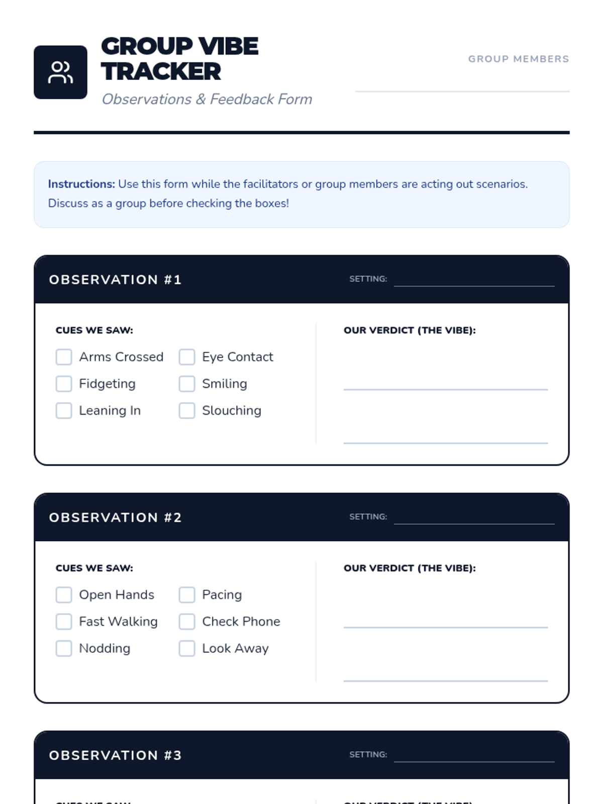 A comprehensive group-focused observation and feedback form for tracking body language. Features 10 observation blocks across 4 pages with high-contrast handwriting areas and clear checklist items. Revised with standardized cue lists and improved handwriting space.