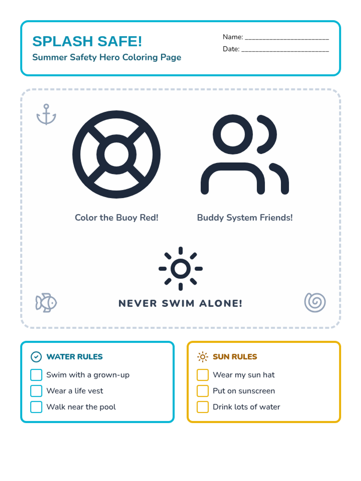 An engaging water safety-themed coloring page for 1st graders featuring the 'Summer Safety Hero' terminology.