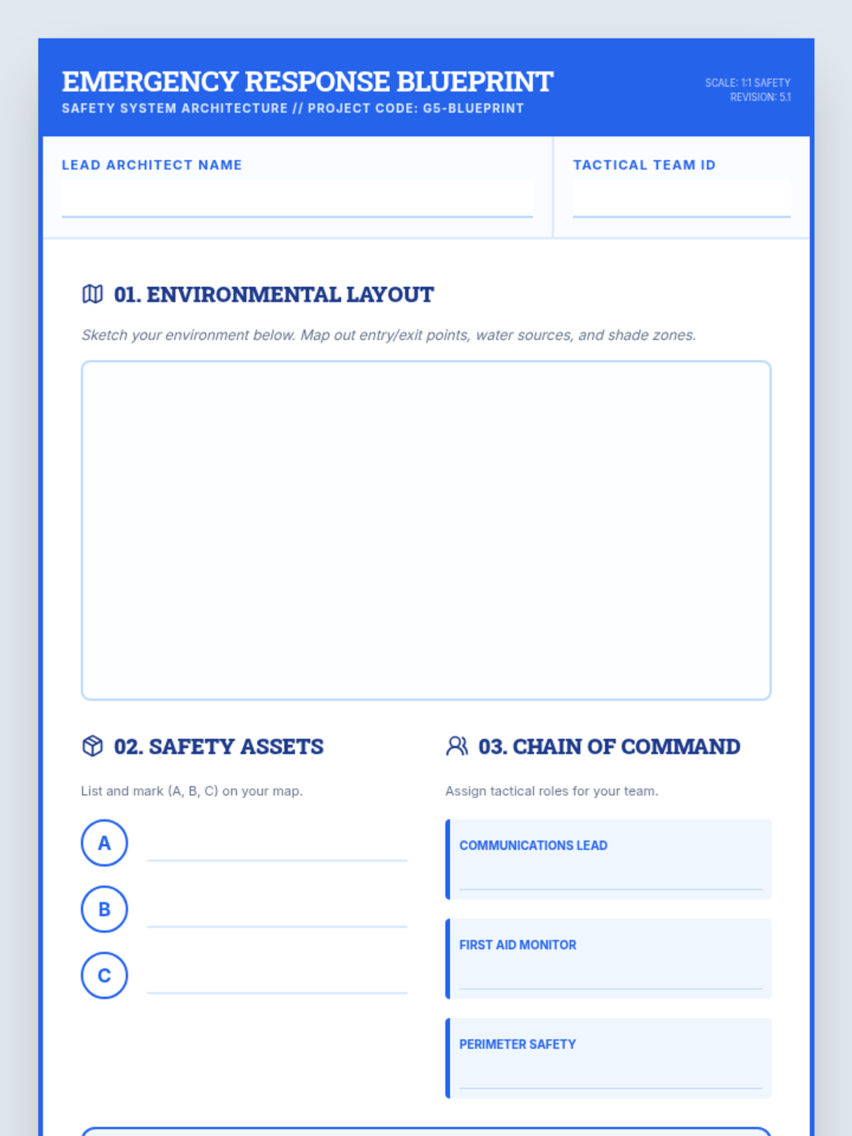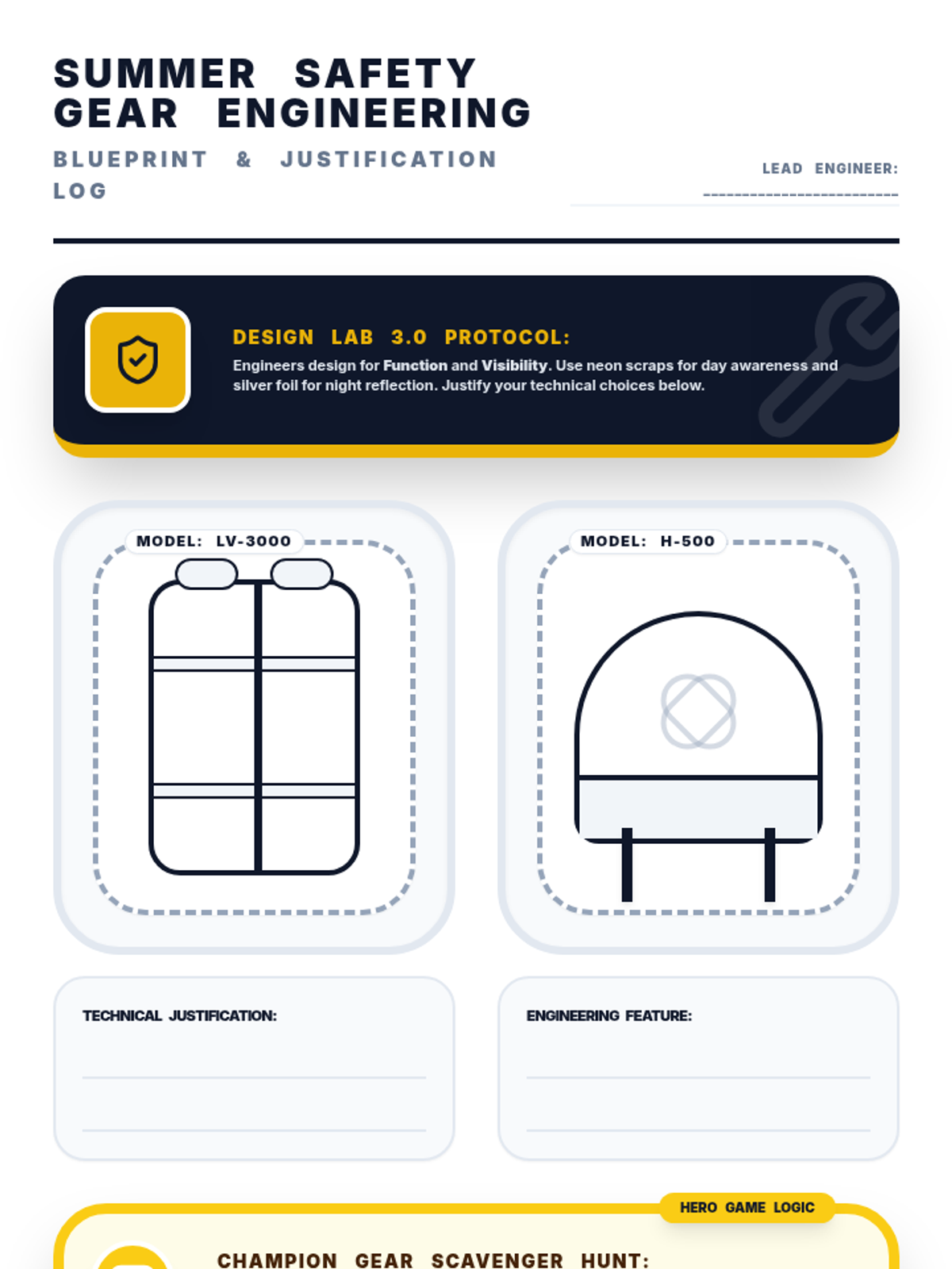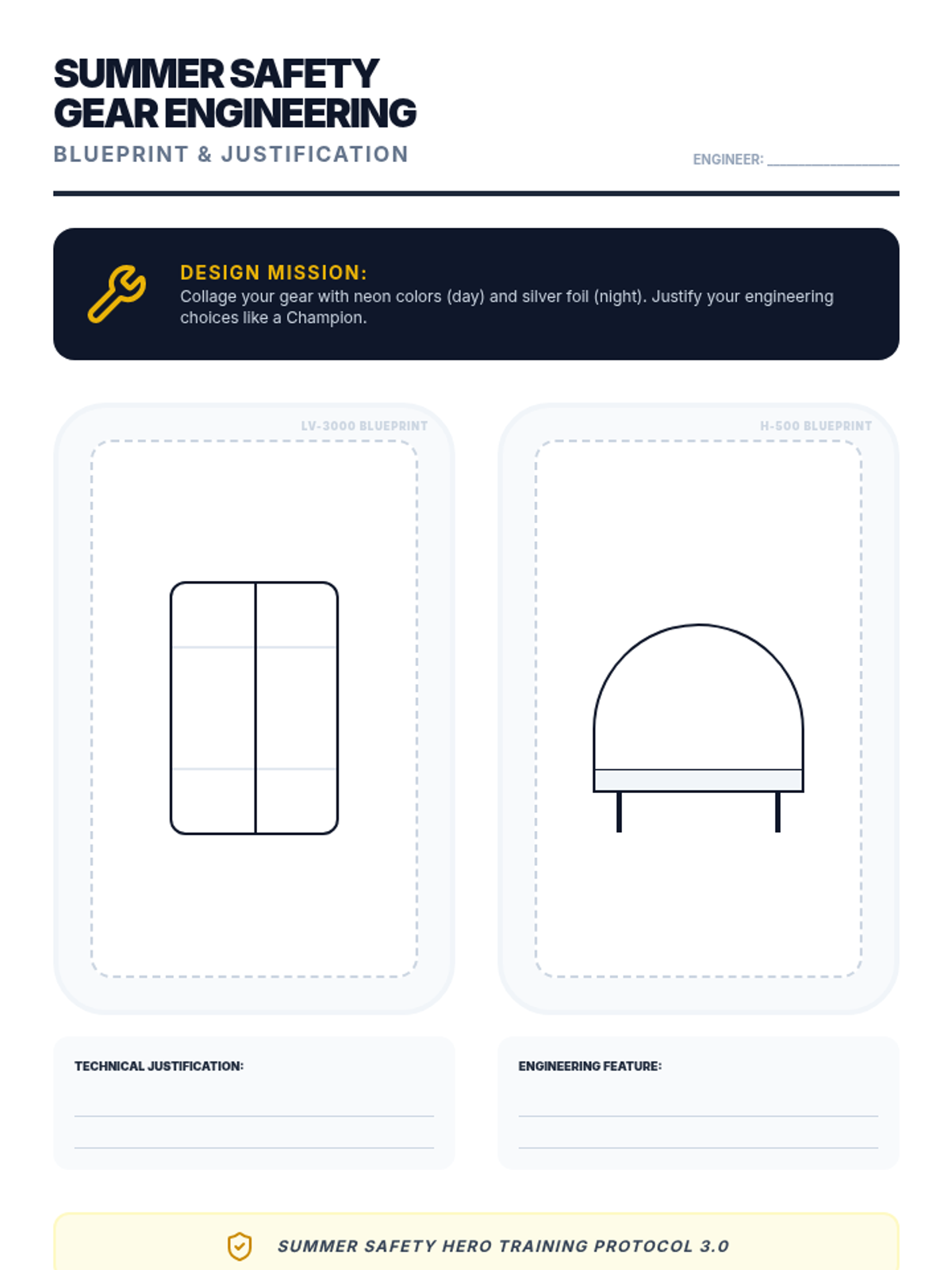 An engineering-focused blueprint worksheet for 5th graders to design and map out safety systems and emergency response plans for summer environments. Now optimized for single-page use with improved legibility.