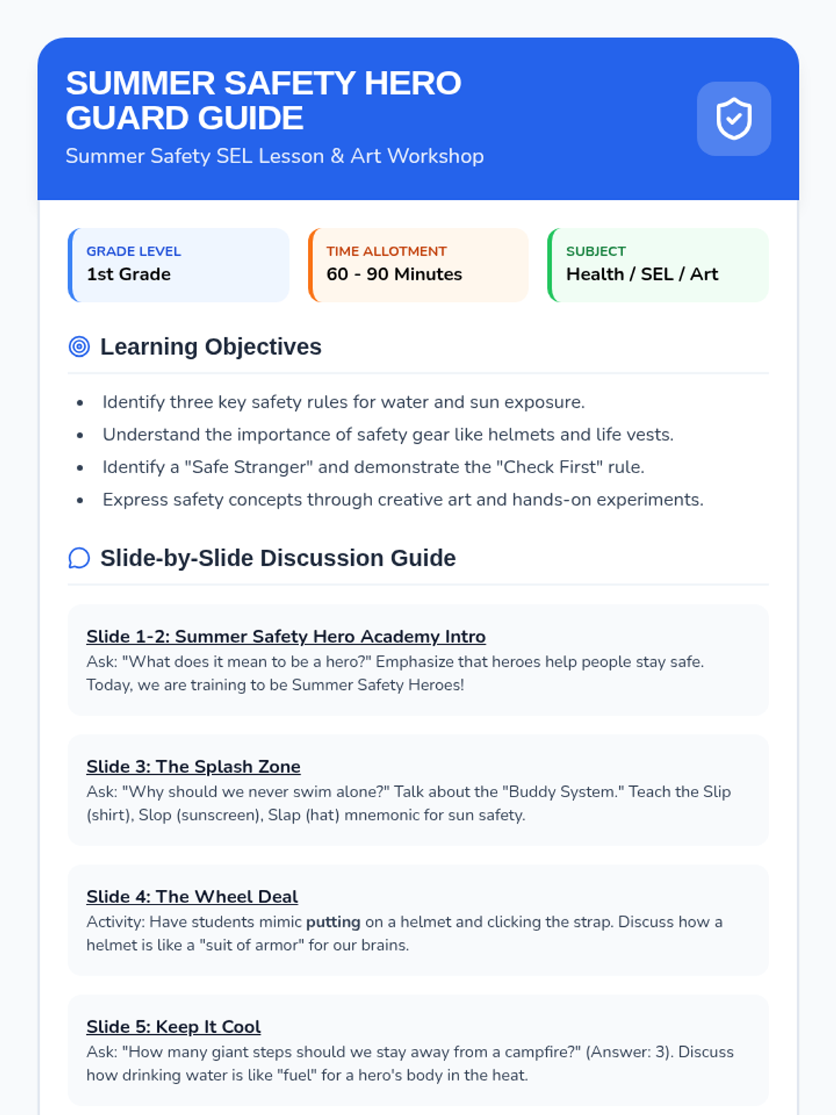 A comprehensive teacher facilitation guide for 3rd grade summer safety, now including the Summer Safety Hero Game instructions and optimized page layout.