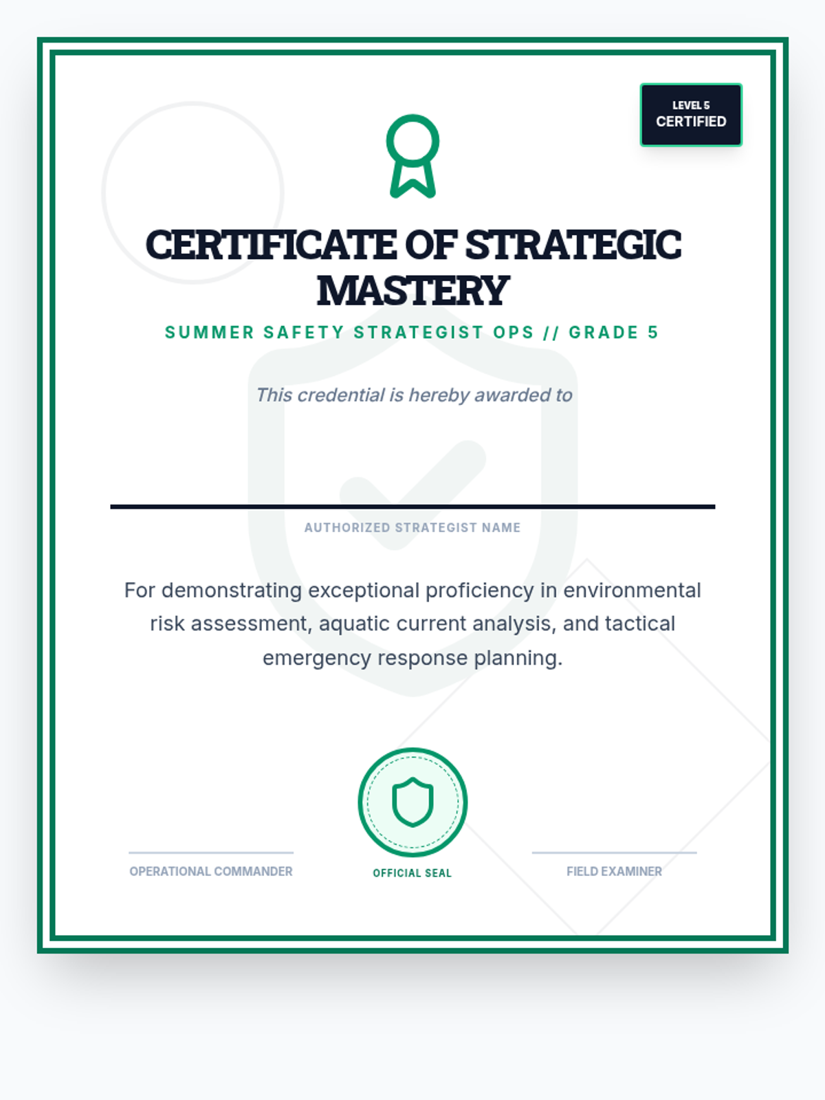A professional-style completion certificate for 5th grade Summer Safety Strategists, featuring a tactical design and official mastery wording.